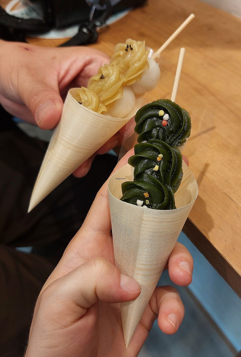 Mochi made vegan. Different vegan options like sweet potatoes, drinks and shaved ice! Small shop, mostly for take away, staff is very friendly and can explain you about the different options.