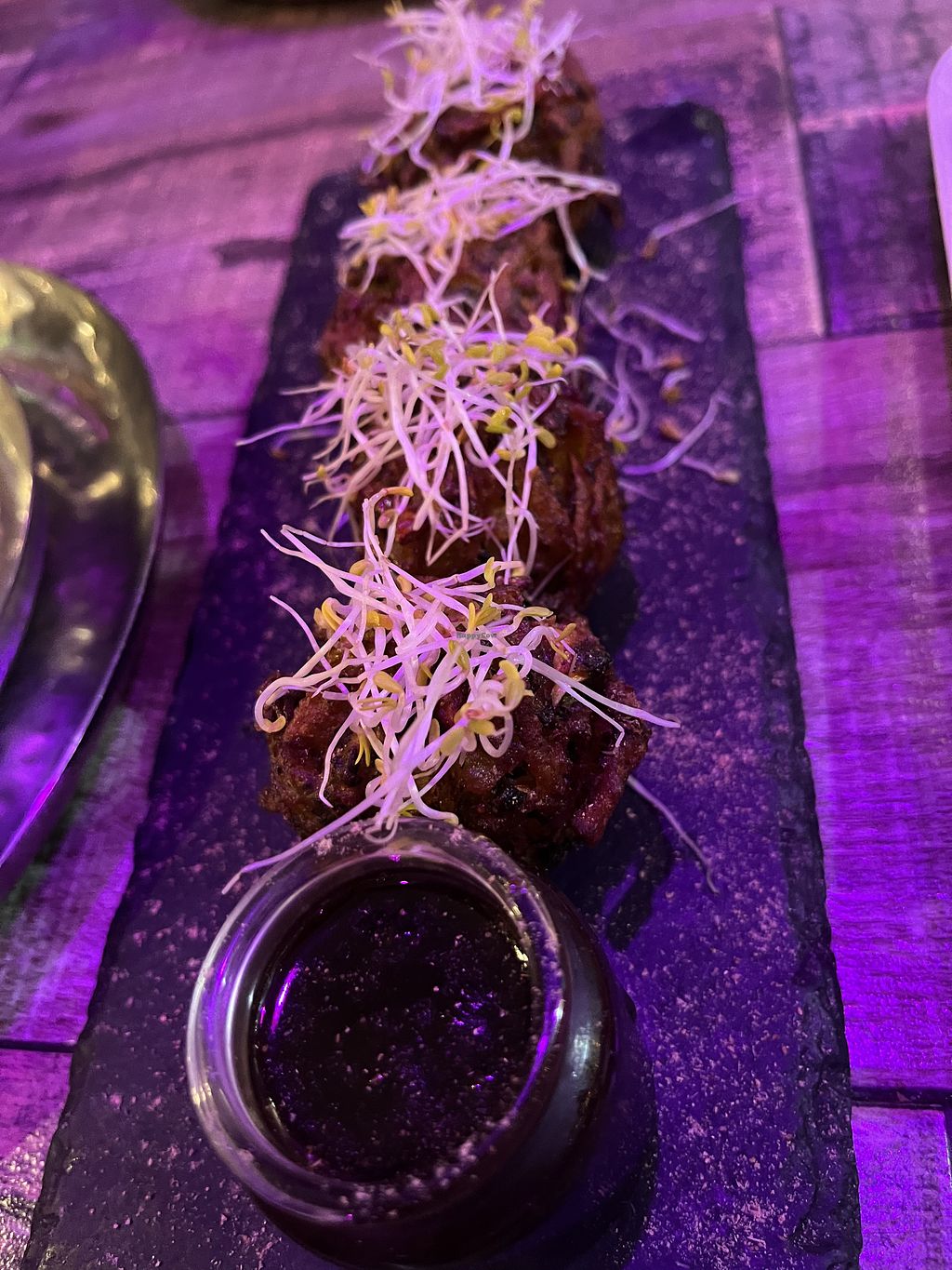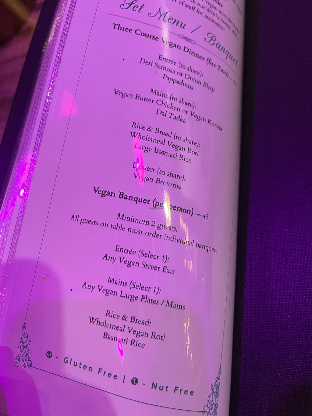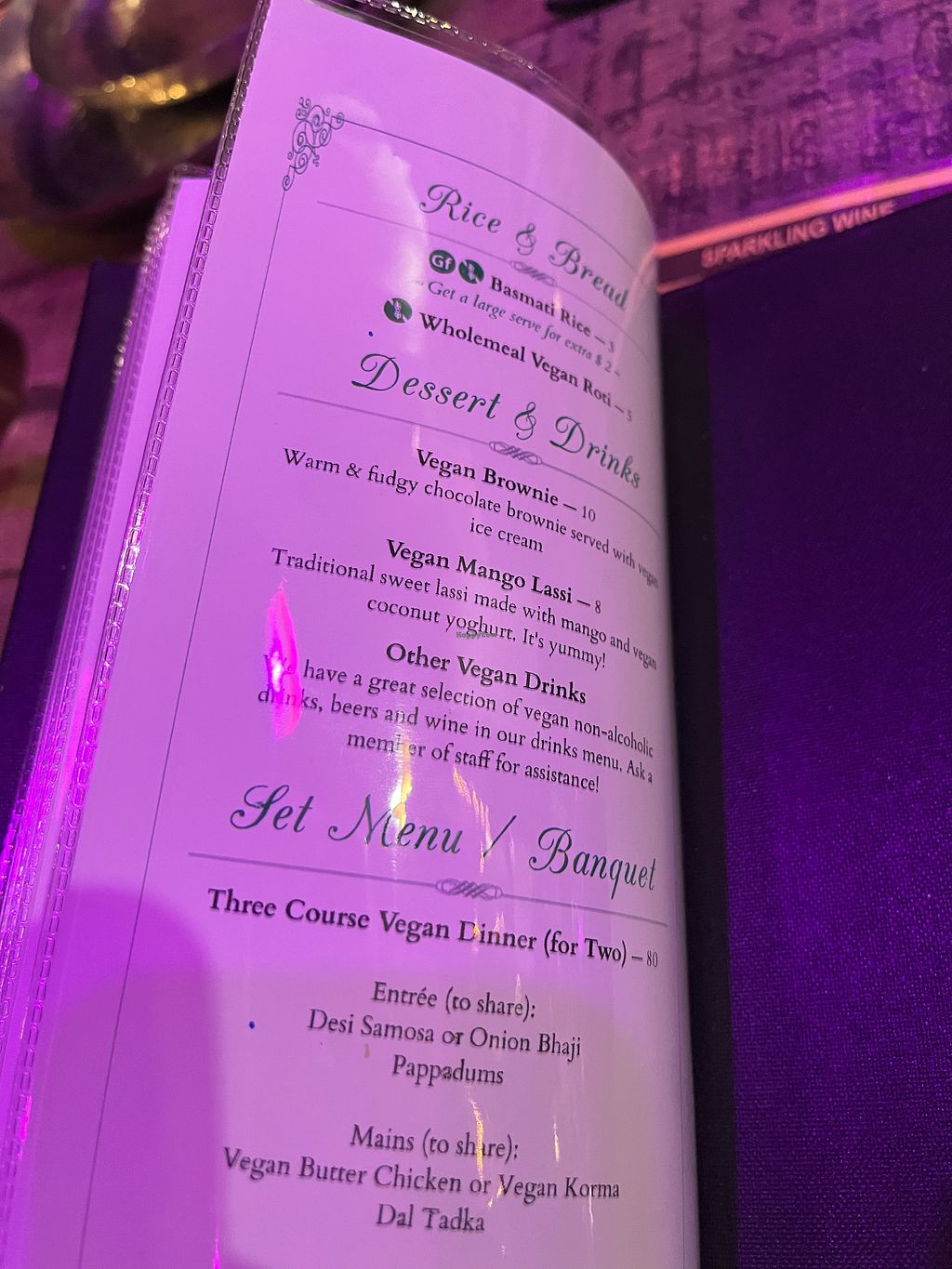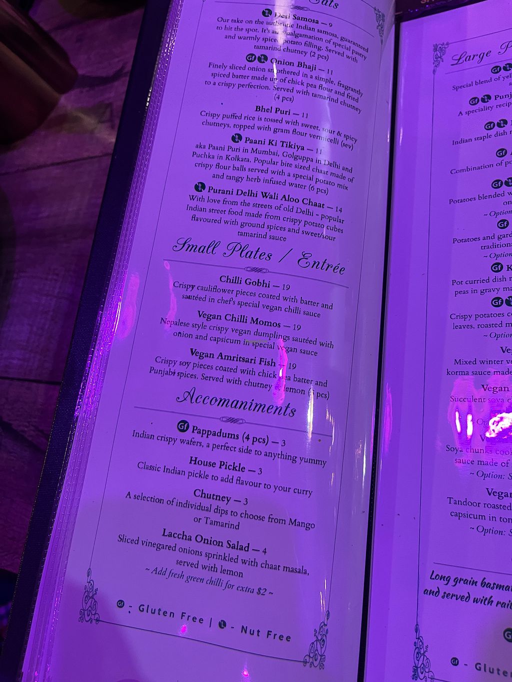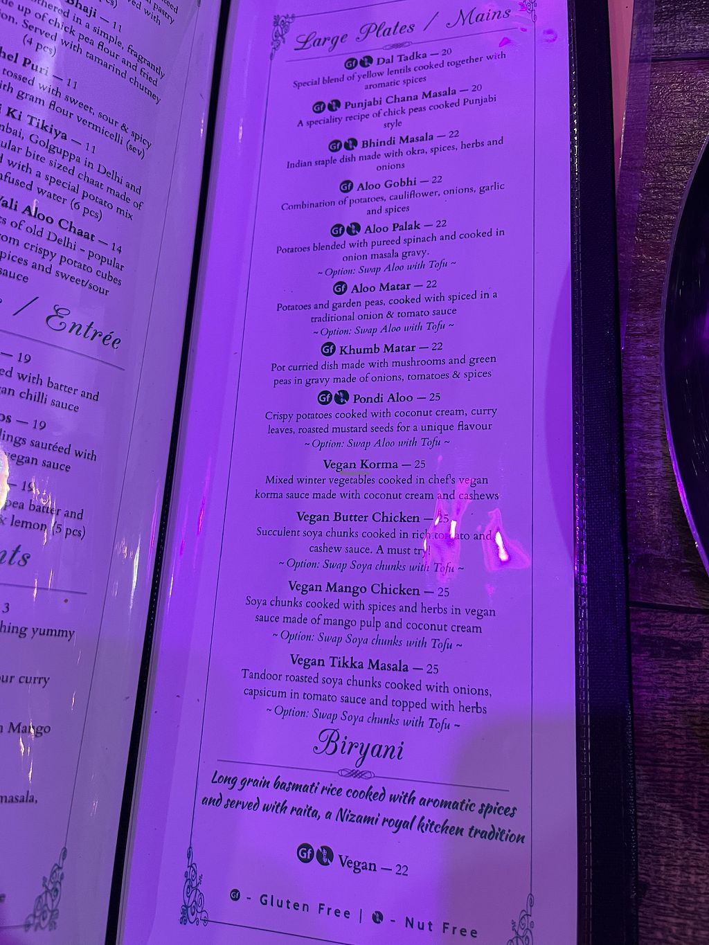 Delicious food! Full vegan menu available alongside the normal menu. Delicious mains - especially the aloo gobi (not sure I spelled that right! But it was potato and cauliflower dish that was to die for!) Cocktails are intriguing with an Indian twist! Highly recommend!