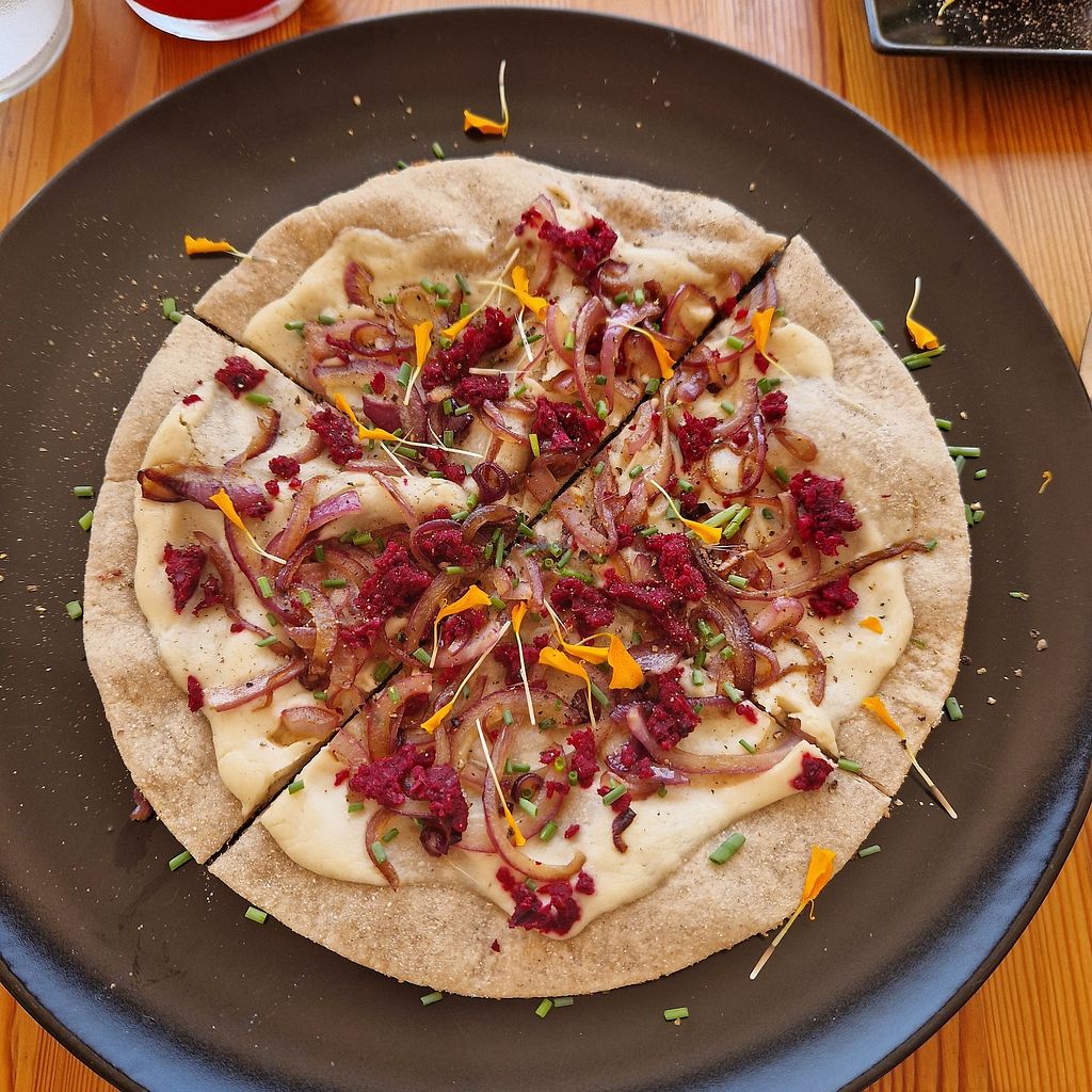1. TARTE FLAMBÈ TOPPED WITH PUMPKIN, ONIONS, VEGGIE MEAT, CASHEW SOUR CREAM
