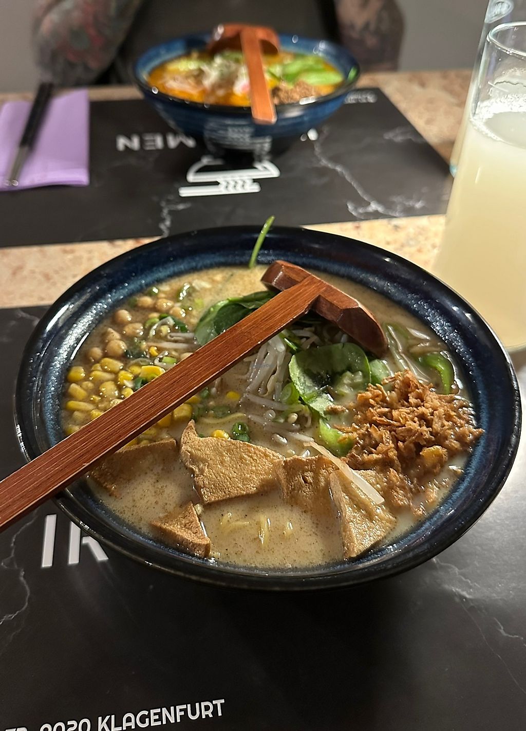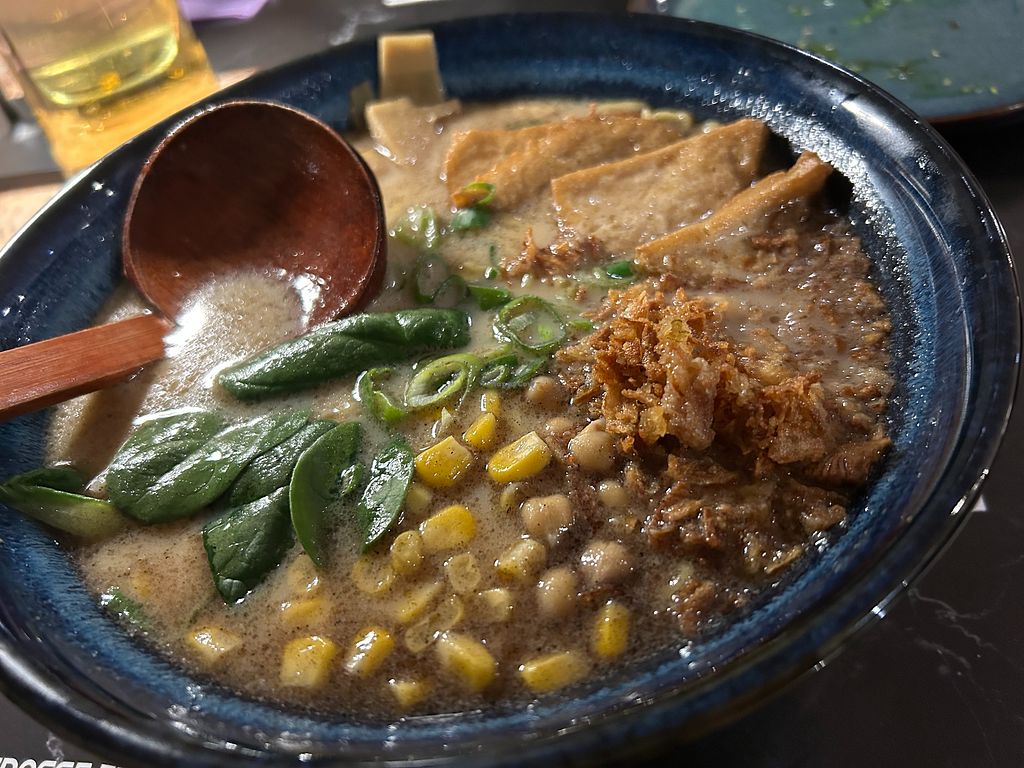 Das Ramen ist auf Sojamilch Basis, mit viel Proteinen Tofu, Kichererbsen, Mais. Gute Nudeln, frisches Gemüse und große Menge.