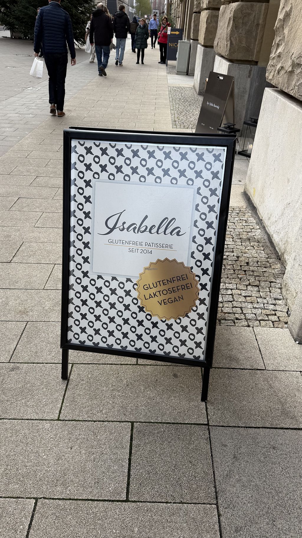 They had 3 different vegan cakes when I was there. Staff was very friendly! The patisserie is a bit hidden inside a quiet, small shopping center in the Alte Oberpostdirektion. The cakes are rather pricey (~5.50 € per piece) but good value for their money. After all, Isabella is a specialised Patisserie and not an ordinary café.