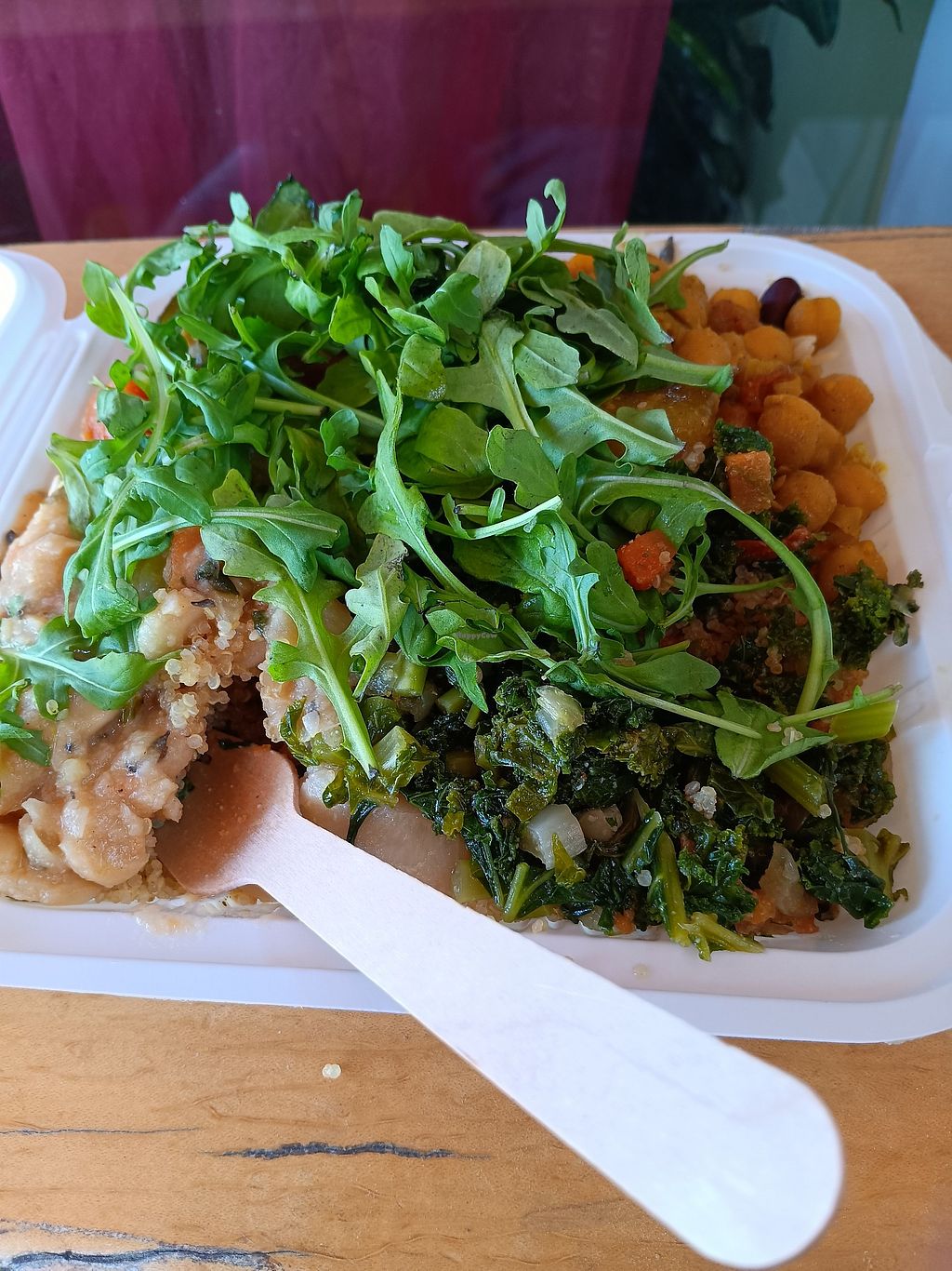 Love this place! I come back all the time. It's my first choice for nearby cheap vegan takeout. They've got amazing Carribean food, and with a rotating selection of stews and bases, they've always got a different selection everytime I go. Their BBQ plant based protein that they put on top of every meal is my favourite thing. It's so tasty! They've also got really tasty smoothies and desserts.