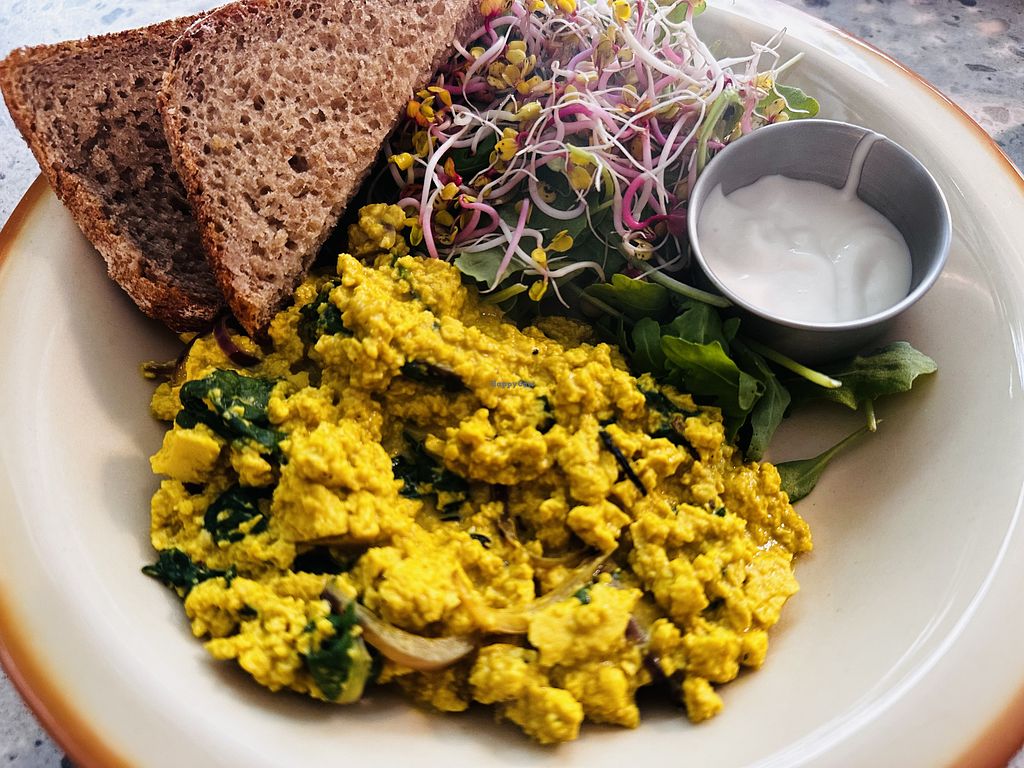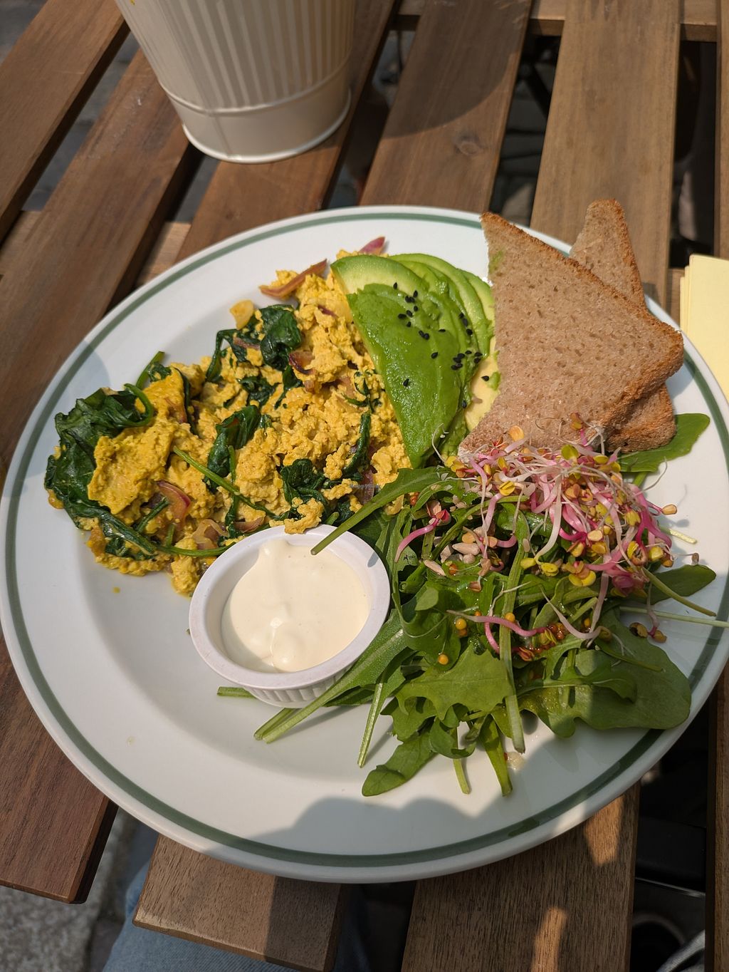 I had the tofu scramble with avocado, it was really delicious, and staff were able to offer english menus and were very friendly. The other vegan breakfast option was shashuka which they can offer with chickpeas. They also had plant milk available and allergens were clearly marked.