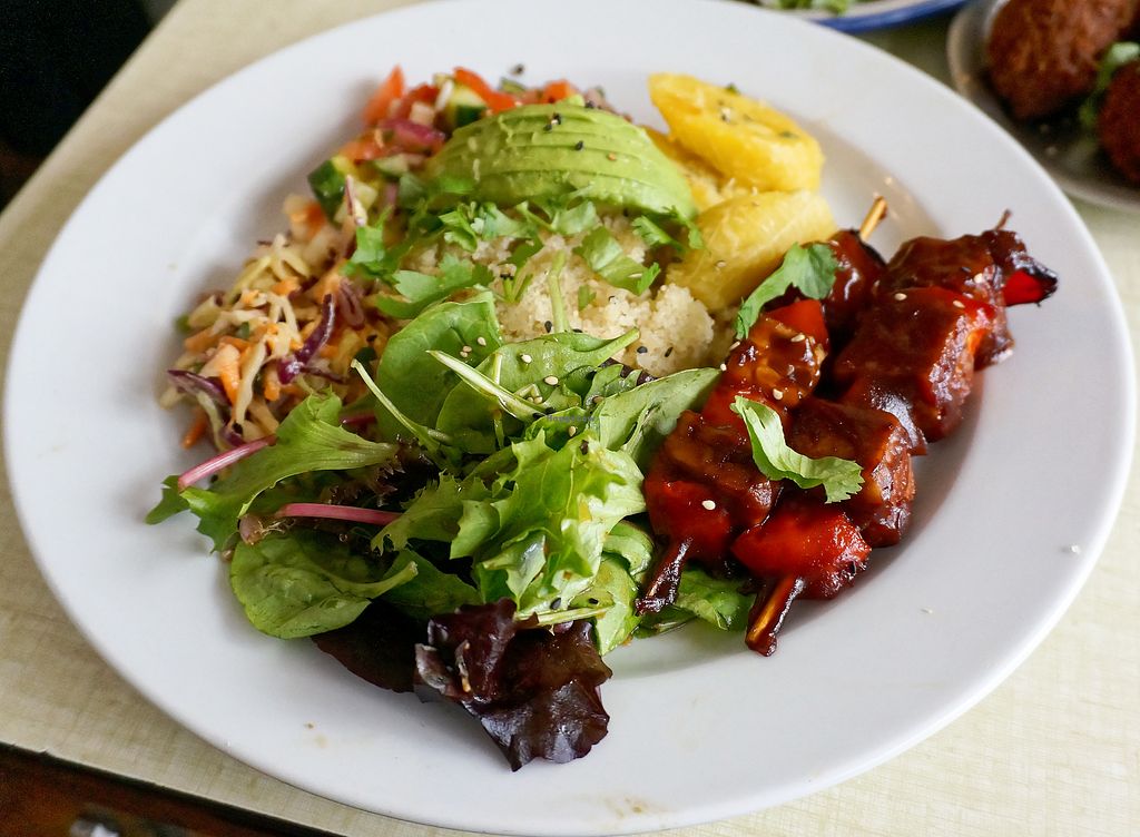 Tempeh skewers, cauliflower wings, plantain