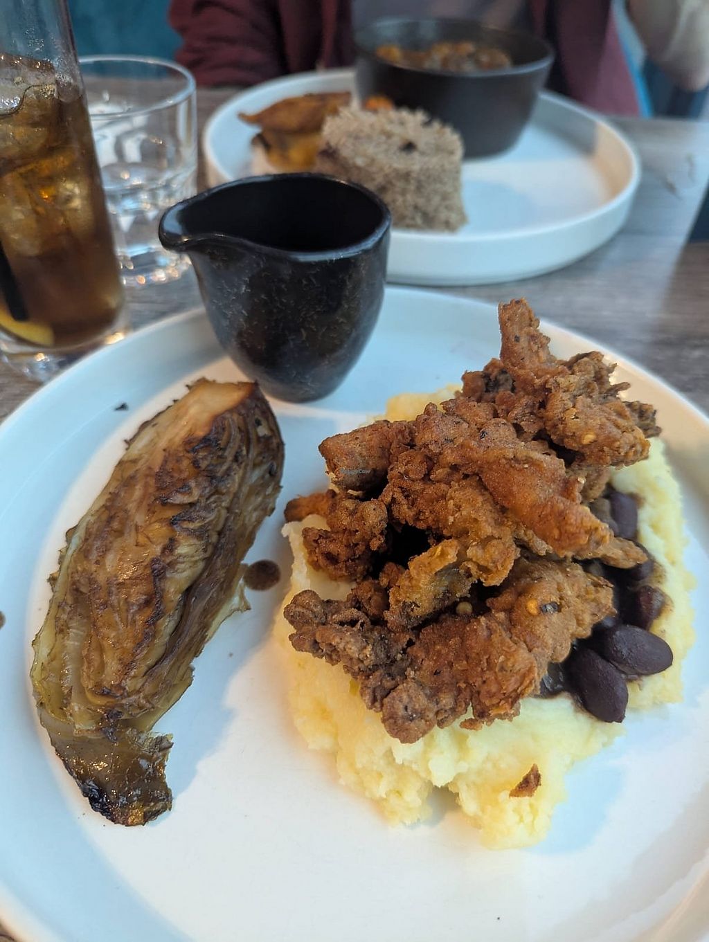 I went with friends on a friday night - it isnt a massive place so it was got really full as we were there which i think contributed to a few mix ups with our orders. The food was great, especially my ‘chicken’ mash and gravy, but we got a selection of different nibbles, sides and my big plate which came out at different times without warning/ the option to come at once. We also got the wrong plates, so one of my friends ate hers cold. The staff were nice though, and had been before without the same problems so I think we just caught them on a bad day.