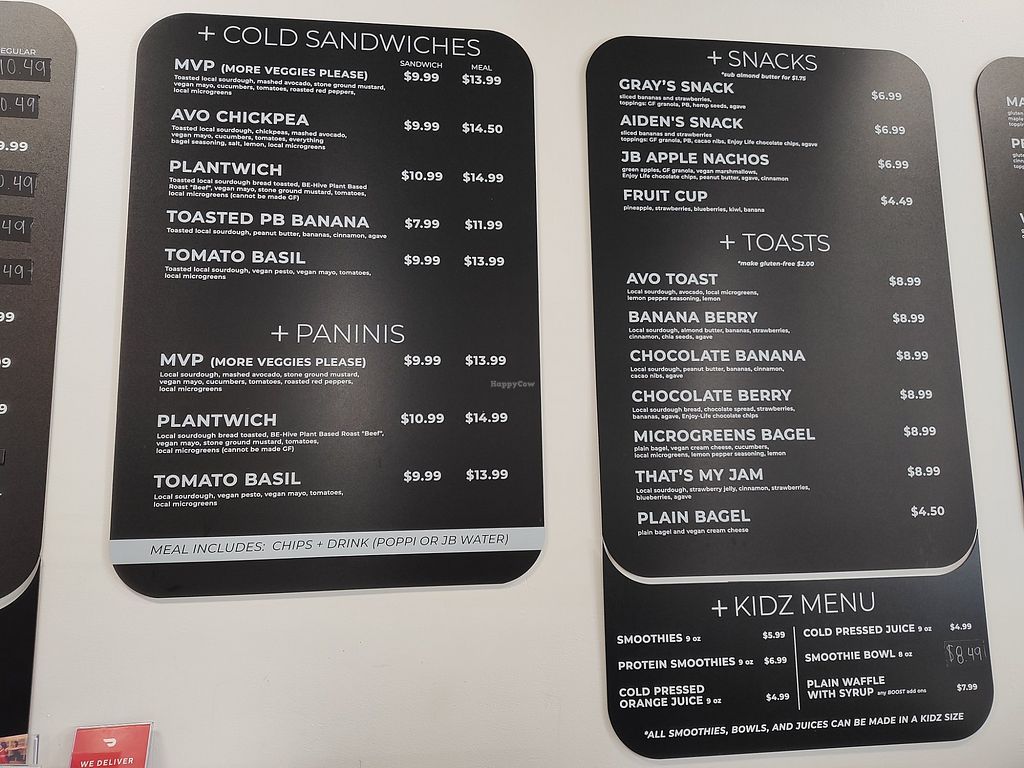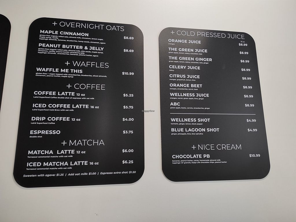 A fully vegan health + wellness cafe. Serves food such as cold sandwiches, paninis, snacks, toasts, overnight oats, waffles and more. Has some grab 'n go treats and grab 'n go juices. Also on the menu are smoothie bowls, smoothies, fresh cold-pressed juices, Matcha, and coffee. Open Mon-Fri 7:00am-4:00pm, Sat 8:00am-4:00pm. Closed Sun.