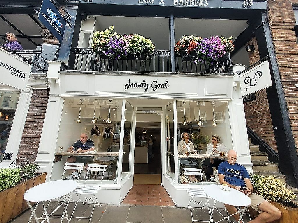 Jaunty Goat Bridge Street is the first opened location of the Chester-based vegetarian business Jaunty Goat. The café is inspired by Scandinavian design, resulting in a sleek and minimalist space with an abundance of natural light. There is also outdoor seating available by the entrance. Jaunty Goat Bridge Street is open until 5 pm daily, with the kitchen closing at 3 pm, and most of the menu, including the pastries and cakes, is vegan.