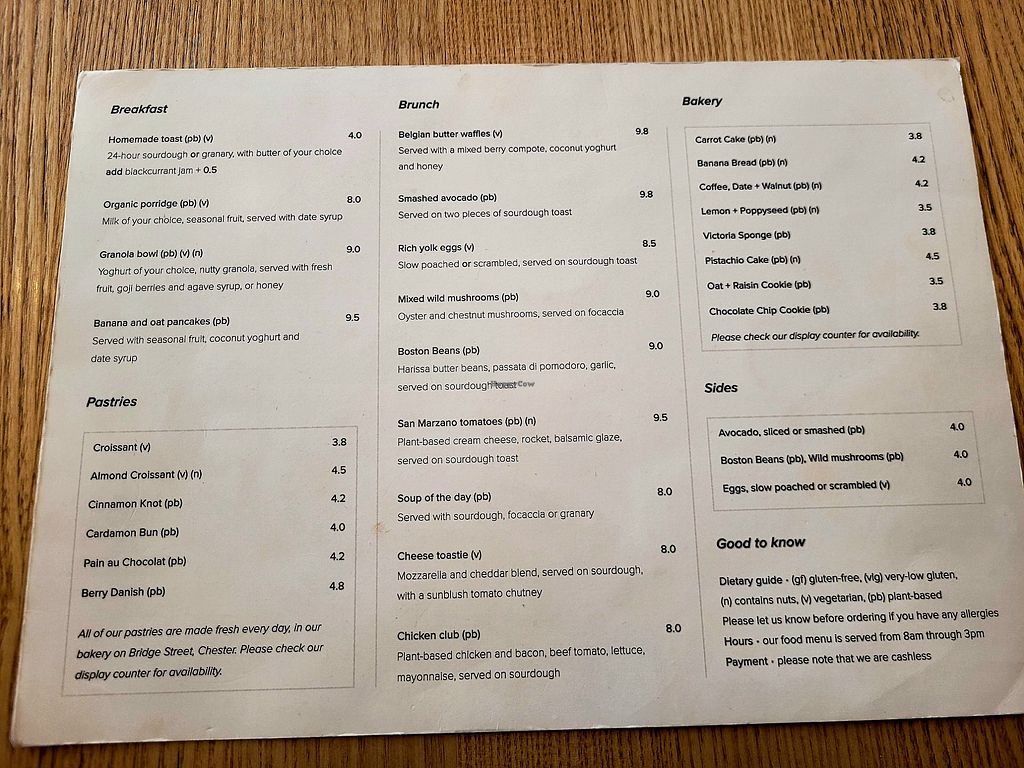 Read moreI have visited a few times for coffee and baked treats, but I haven't had a meal from here yet. The menu consists of breakfast and brunch items, with many dishes being based on their home-baked sourdough bread, such as Smashed Avocado, Mixed Wild Mushrooms, Boston Beans, and San Marzano Tomatoes. Some other vegan food options include Granola Bowl, Banana & Oat Pancakes, Chicken Club, and Soup of the Day. Some of the vegan pastries and cakes include: