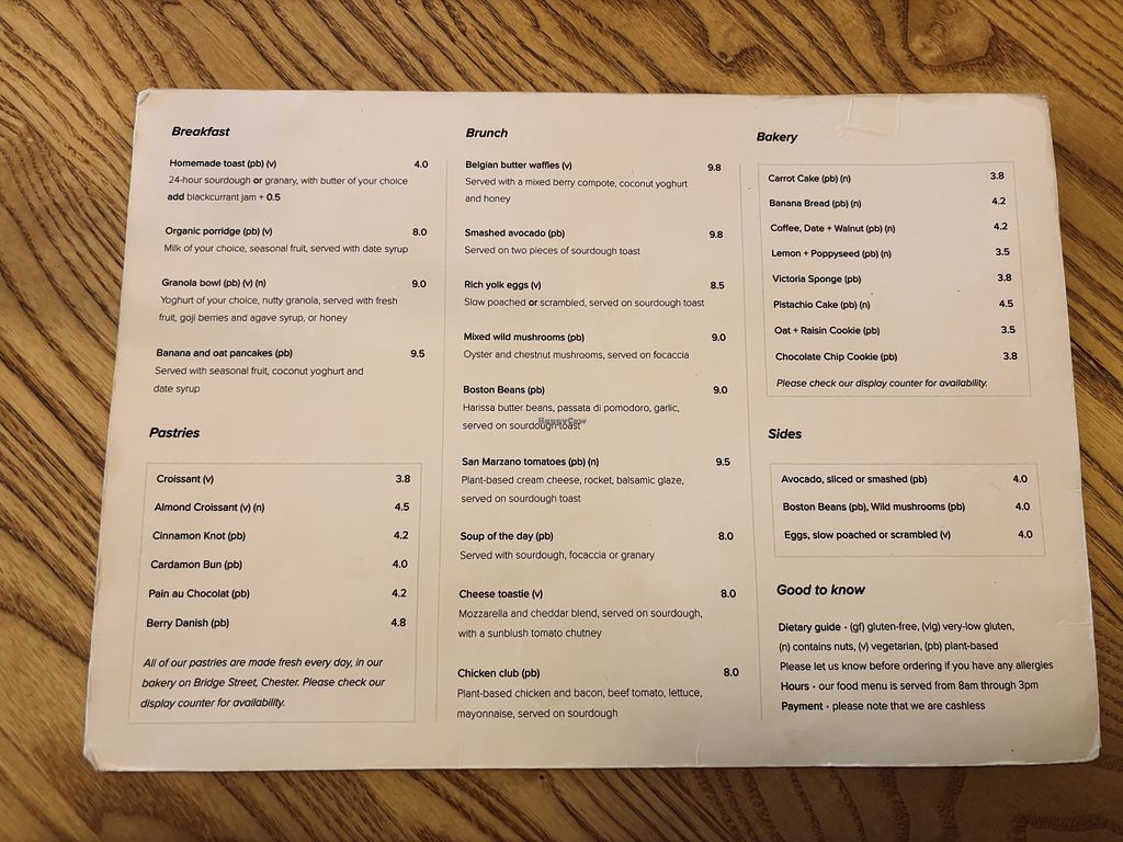 We didn’t have anything to eat but the selection of vegan cakes and pastries was amazing! I’ve never seen so much selection. Normally you’re lucky to get a vegan flapjack. Wish we were hungry because I had my eye on the cinnamon swirl and lemon and poppyseed cake. I had the matcha iced latte which was delicious. Staff friendly and professional. All looked very clean with their Lucy and Yak aprons. Beautiful decor, just very clean, minimal and trendy. Will be returning and stocking up on cake!!