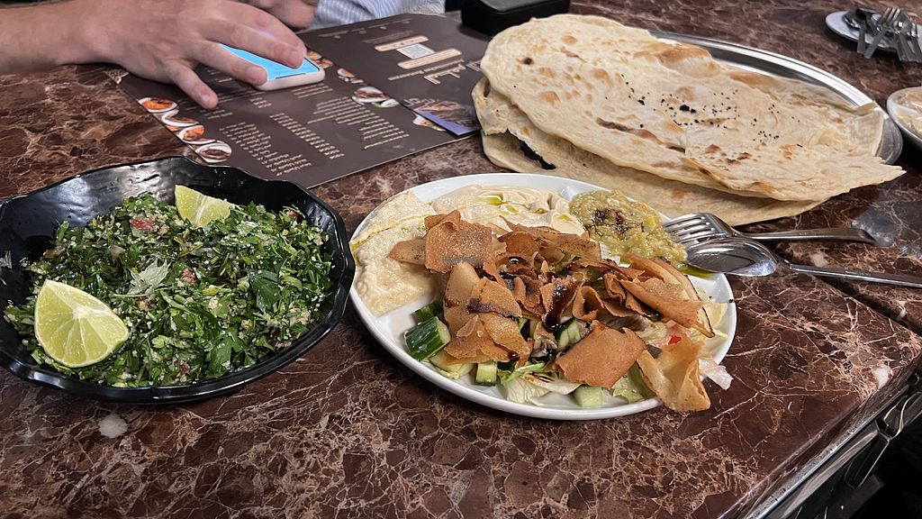 Wir hatten den veganen Vorspeisen Teller und ein Taboule mit großen frisch gebackenen Fladenbroten. Große Portionen, alles frisch zubereitet und sehr lecker. Auch der frische Zitronensaft ist sehr zu empfehlen! 👌