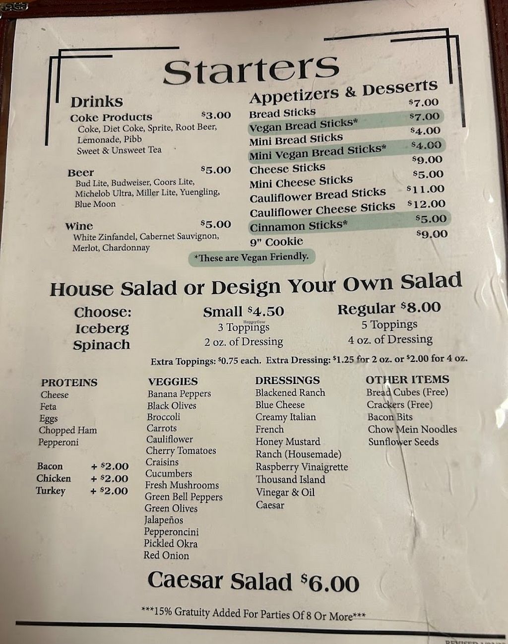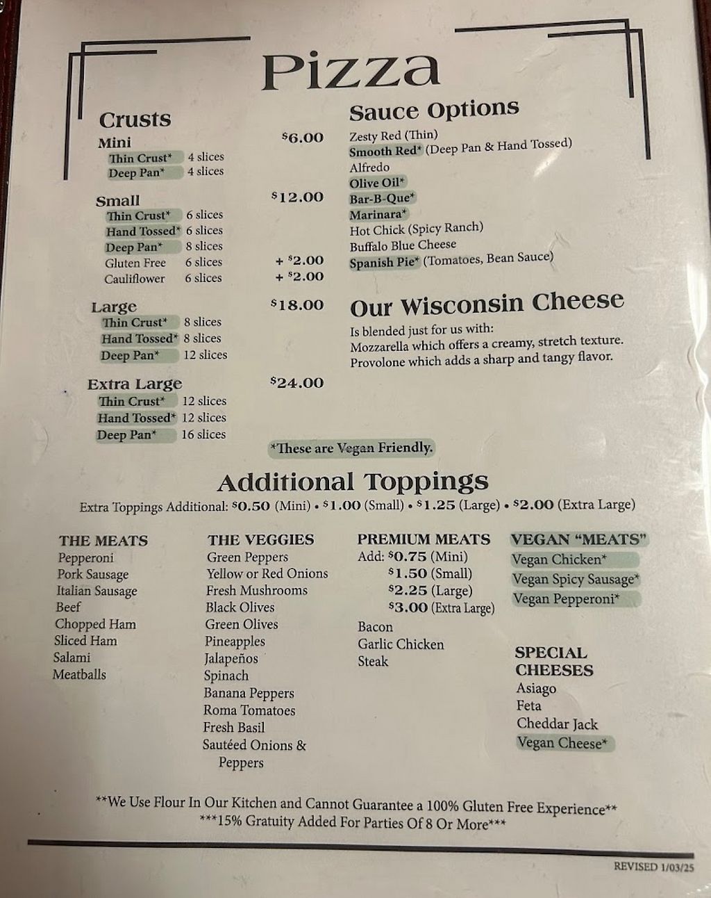 Very friendly establishment with vegan cheese and meats available. I just got a mini vegetarian pizza with vegan cheese and it was really good! I opted for the deep crust and it was delicious! I didn’t try any of the vegan meats because a basic veggie pizza just makes me happy but I bet they’re good because the staff cared very much about quality. A mini left me a little hungry still but I know a small would have been too much pizza for me…so you’re on your own regarding which size to get lol. 🤣