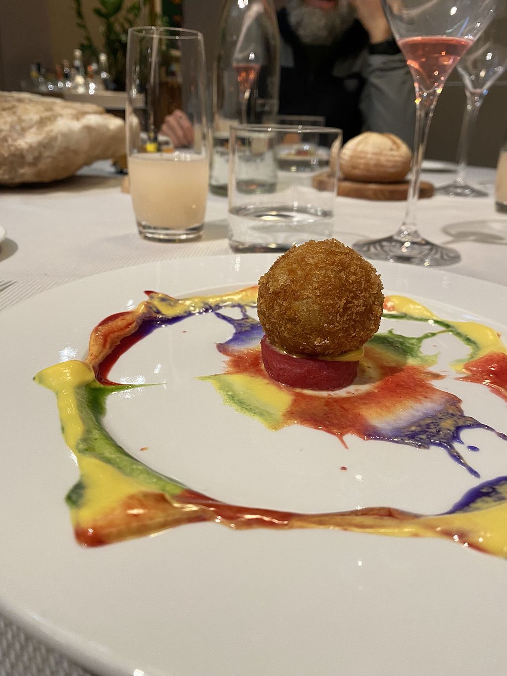 Alta cucina premiata con una stella Michelin. A pranzo offrono un “ piatto quadro” con 4 portate salate a 30 euro; con l aggiunta del dolce 35 euro. Ottimo accostamento di sapori, un’esperienza indimenticabile