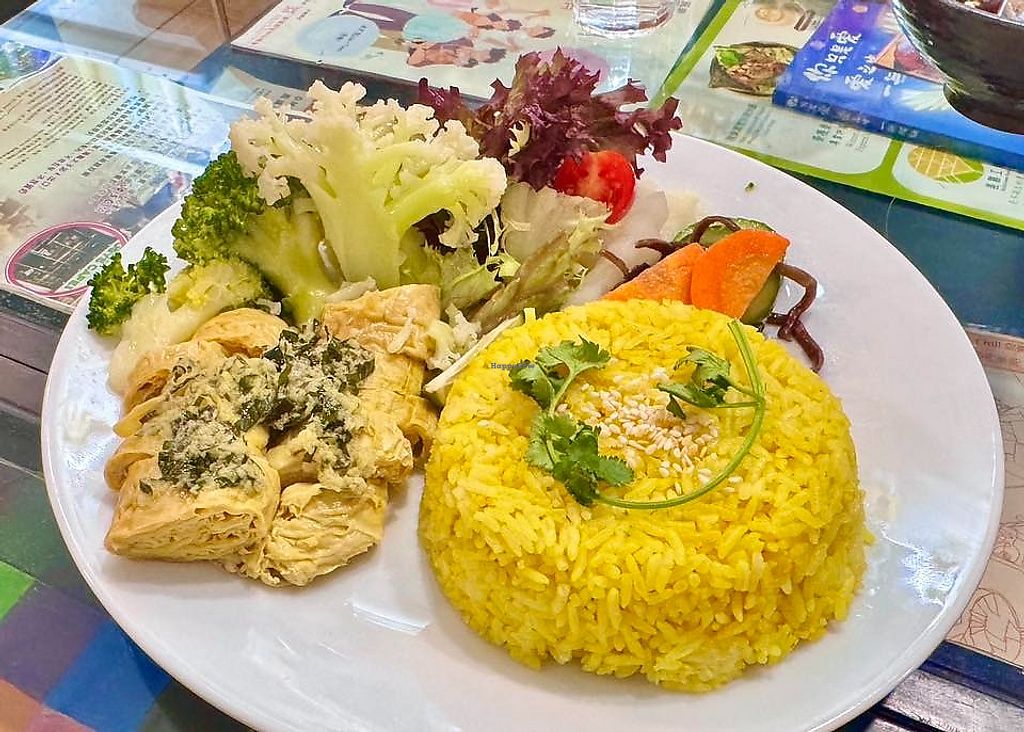 Vegan Hainanese Chicken Turmeric Rice 海南素雞配薑黃飯 (Photo by Emily Ho)