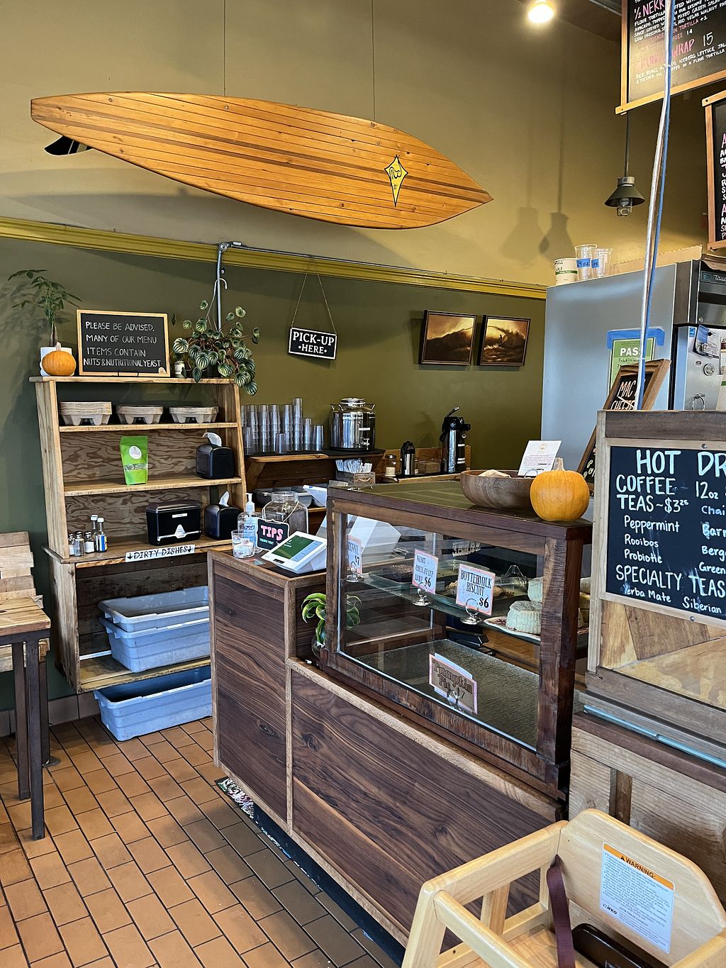 They are located across the street from a surf shop. There is a full size surfboard that hangs on the wall & several paintings of surfers.