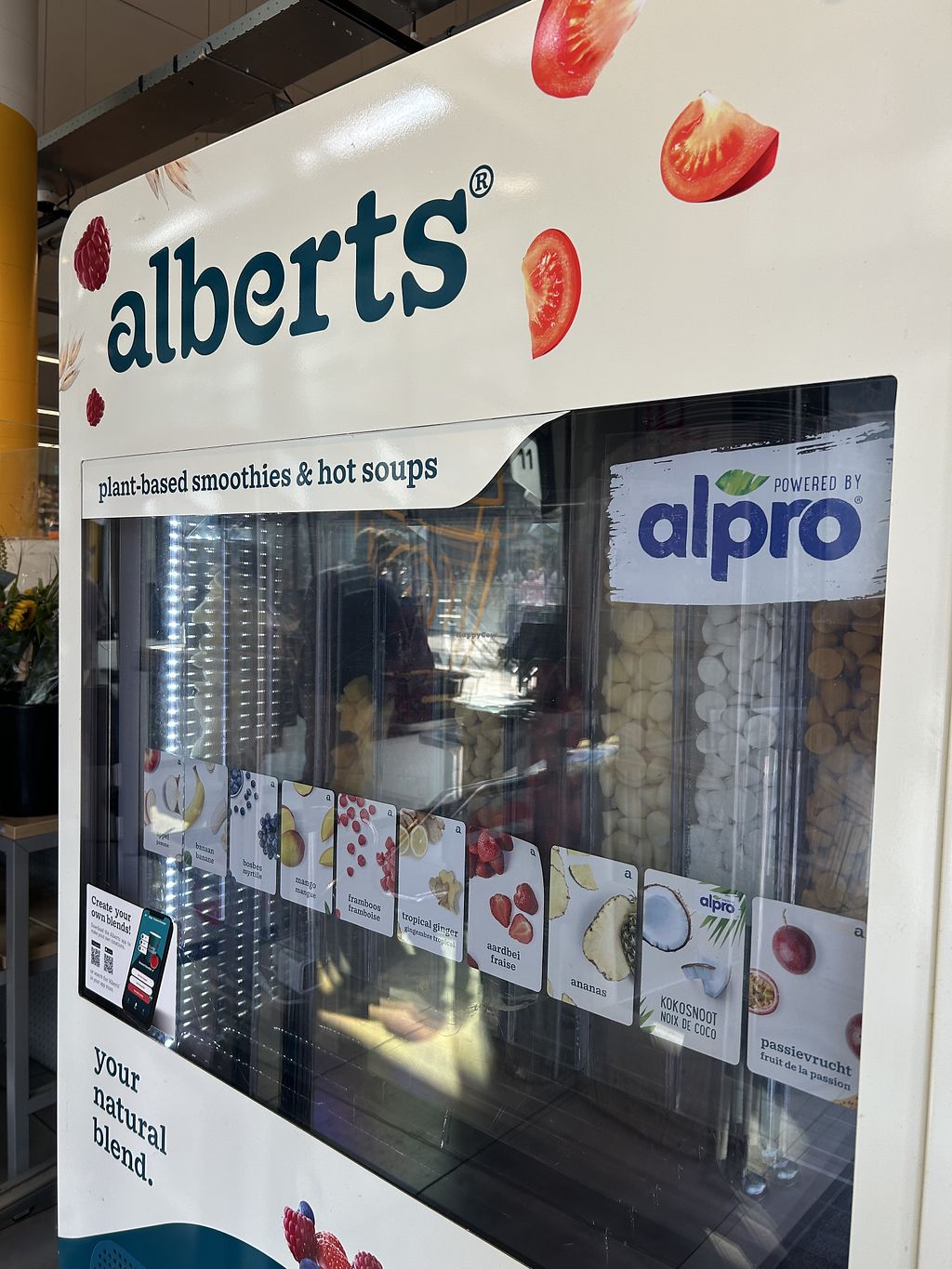Dutch/Belgian supermarket chain offering vegan Valsoia ice cream and a smoothie machine at the checkout with Alpro options. Open Mon-Sun 07:00-20:00.