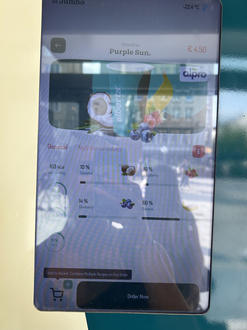 The Jumbo might be small, but they offer Valsoia pistachio ice cream pints, chocolate ice creamsicles and ice cream cookie sandwiches. At the checkout, theres a smoothie machine with 100% frozen fruit ingredients which lists all the nutrients in the drink. There's a specially alpro labelled version.