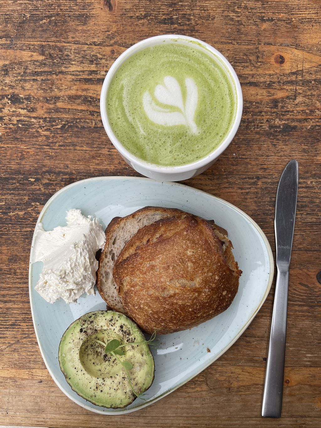 Chocolate cake, New York cheesecake, latte and chai latte.