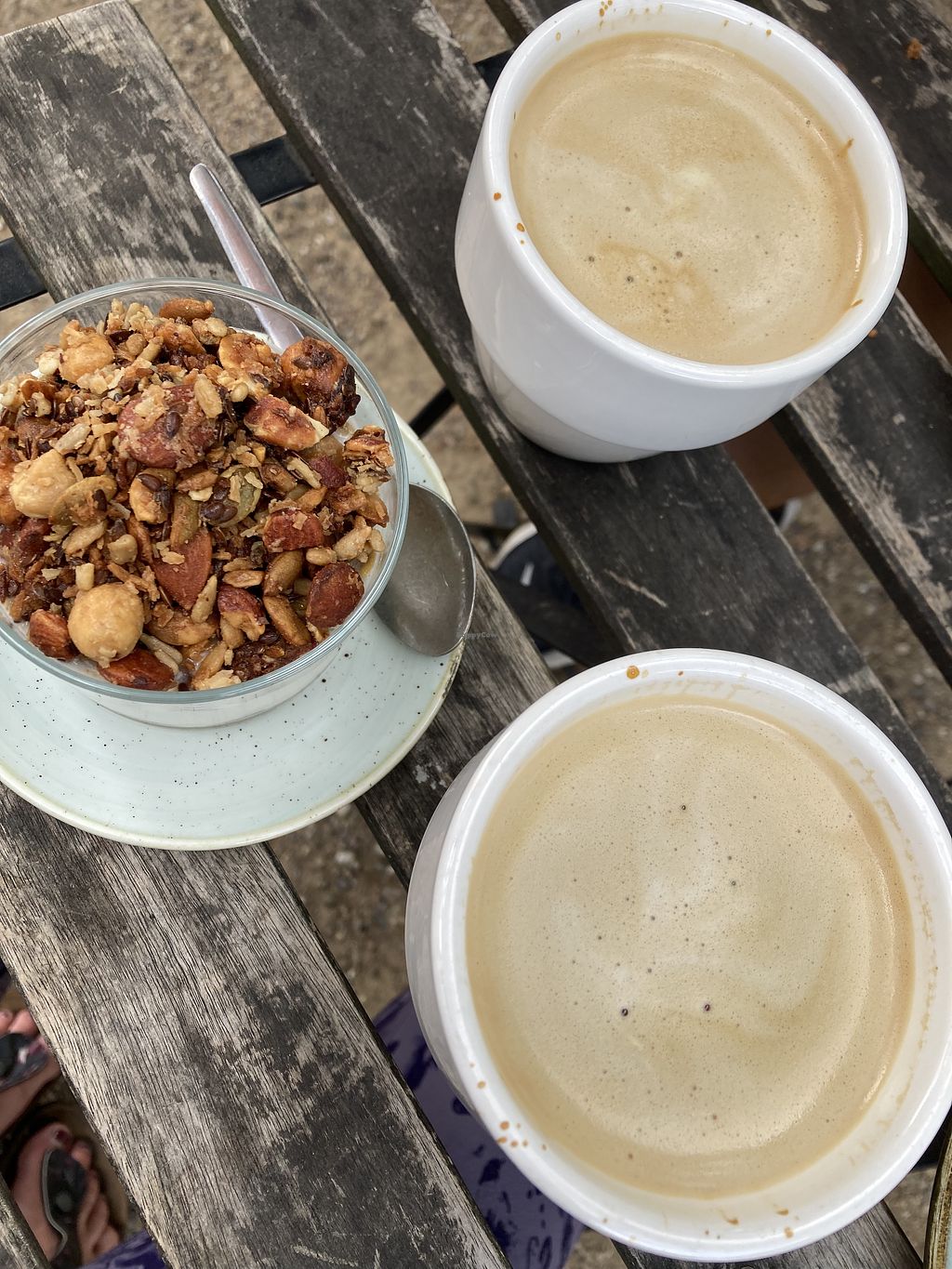 Granola mit Joghurt und Früchtekompott, Americano mit Erbsenmilch