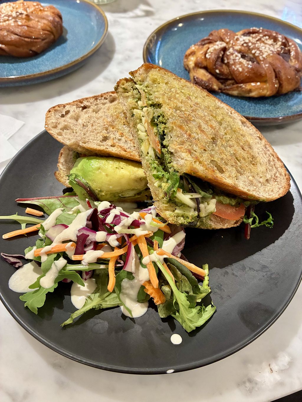 This place is great, everything is plant-based and they have many savoury and sweet options. I had the pesto walnut sandwich, a cinnamon bun and a cappuccino.