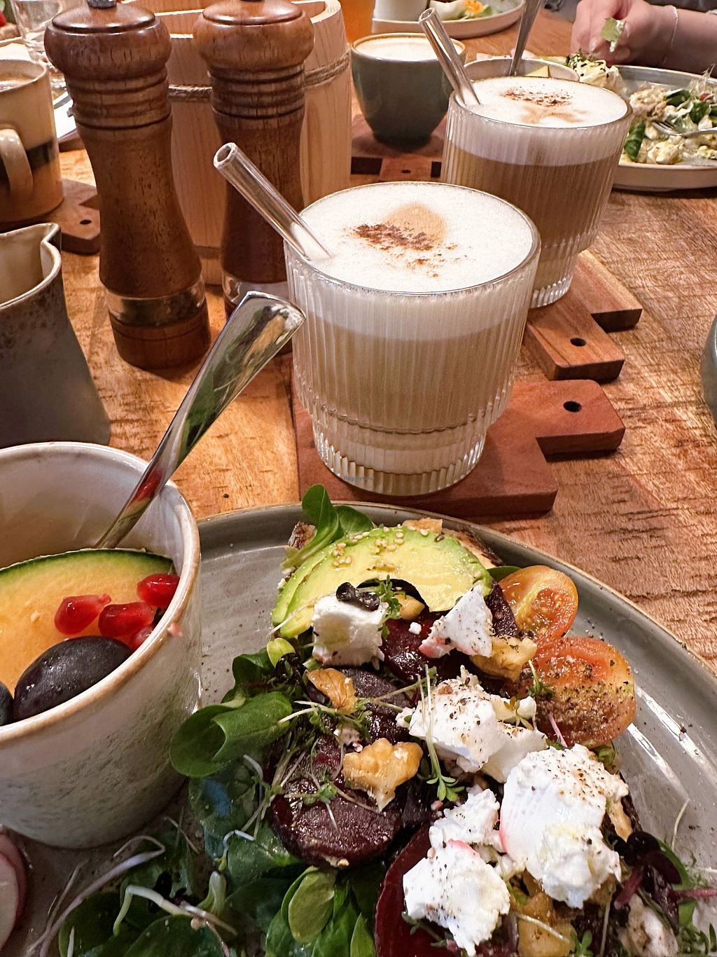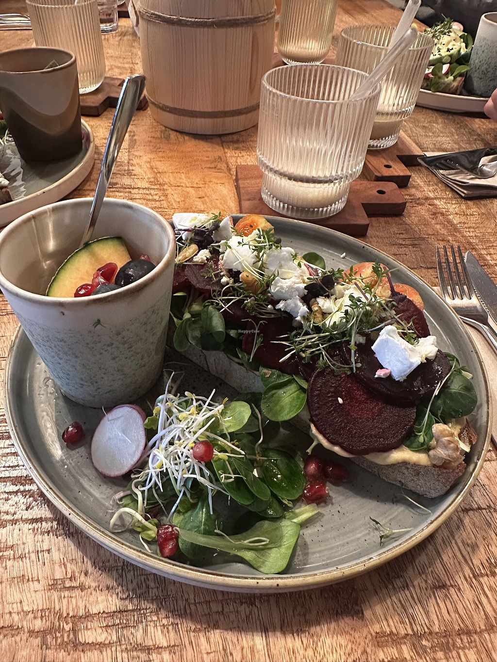 A cute and cozy café with a modern interior. The food is beautifully styled and really pleasing to the eye. The staff was super relaxed and friendly. Our group had different colorful open-faced sandwiches, and there were quite a few vegan options as well. Everything tasted great :)