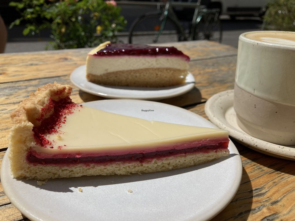 Excellent coffees and cakes. Savory options we tried were good (but -1 star when compared to bakery). We had the scrambled tofu and chickpea vegetable omelette. Plus cakes (white chocolate raspberry cake, blackberry cheesecake) and lattes (oat and matcha).