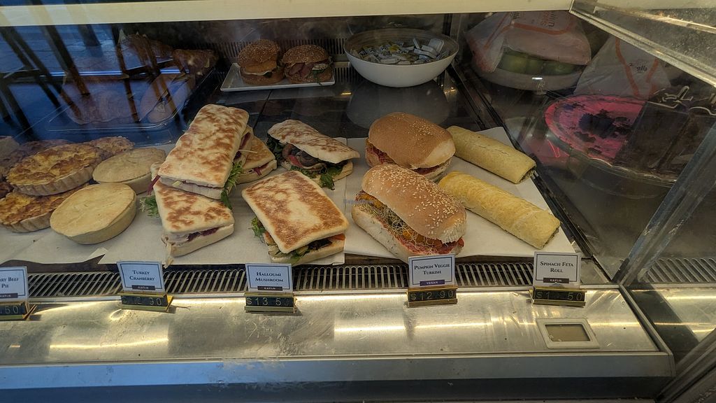Welcoming coffeeshop/café, with breakfast and lunch menu. Sorry that “alternative milks” cost $1 extra, and decaf coffee costs $1 extra! I saw two vegan items in the cabinet: a roasted-veg sandwich and a lemon slice - I enjoyed the latter, along with a good, decaf soymilk latte.