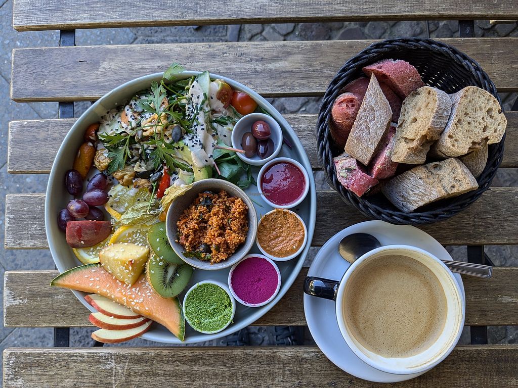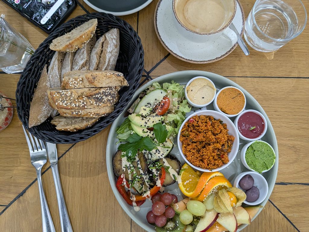 They serve coffee with vegan milk and they have some cake options. But I really love their vegan breakfast plate. With fresh ingredients and amazing sweet and savory spreads.