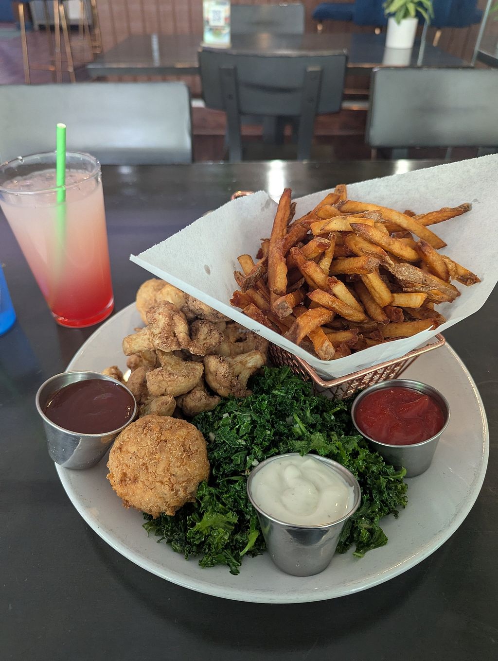 Stopped in and grabbed a feast to-go! I was greeted by a very friendly gentleman that helped me to decide what to choose. There were so many tasty sounding options! I ended up getting the fried oyster mushroom sandwich with Greek fries ( $3) and I added a Mac ball ( $4) on the side. Very cute vibe inside. If I lived here, I could see having casual lunches/dinners here with friends.