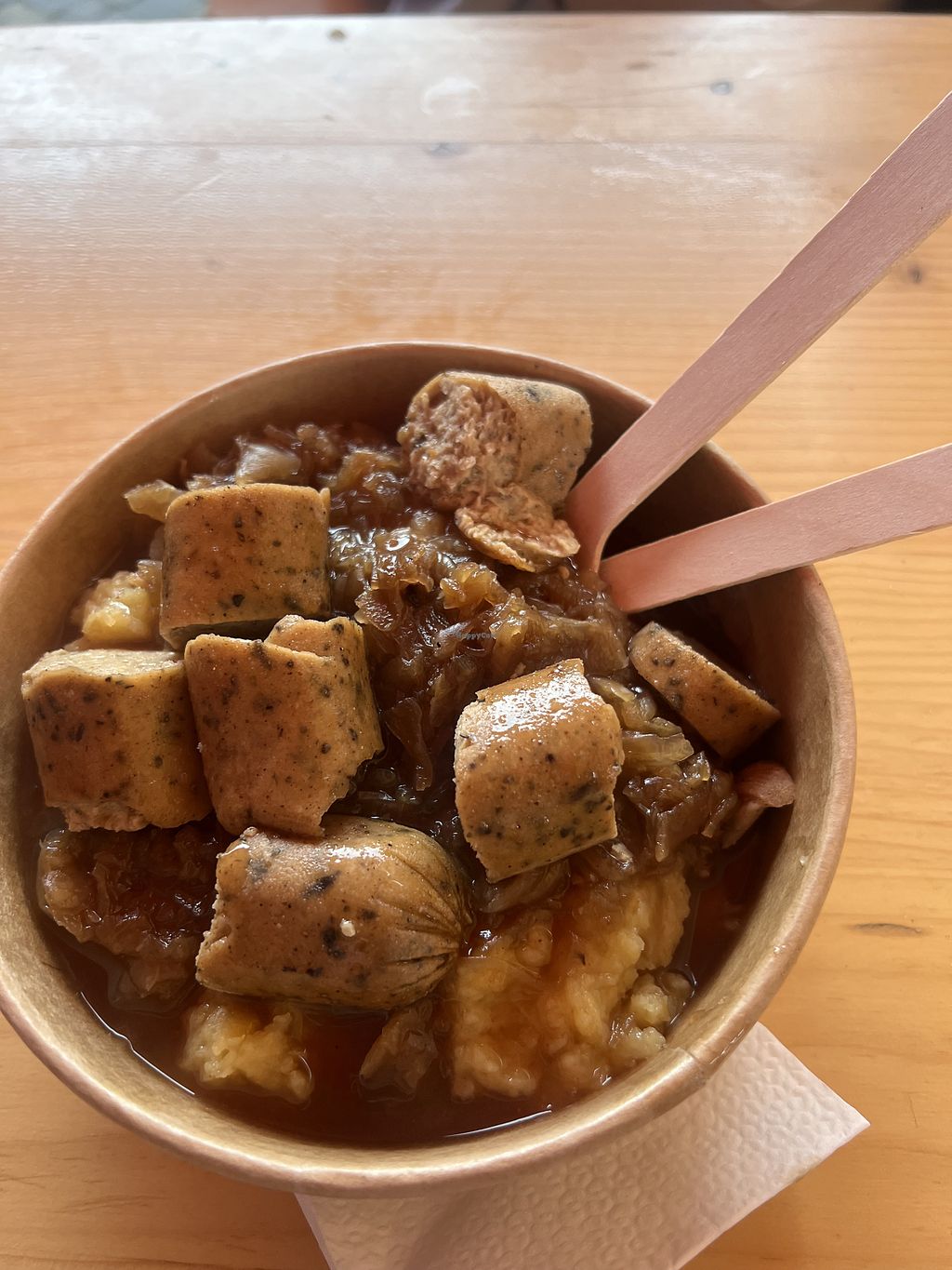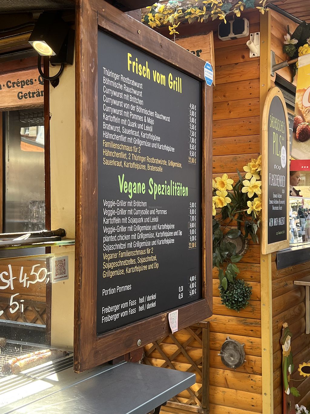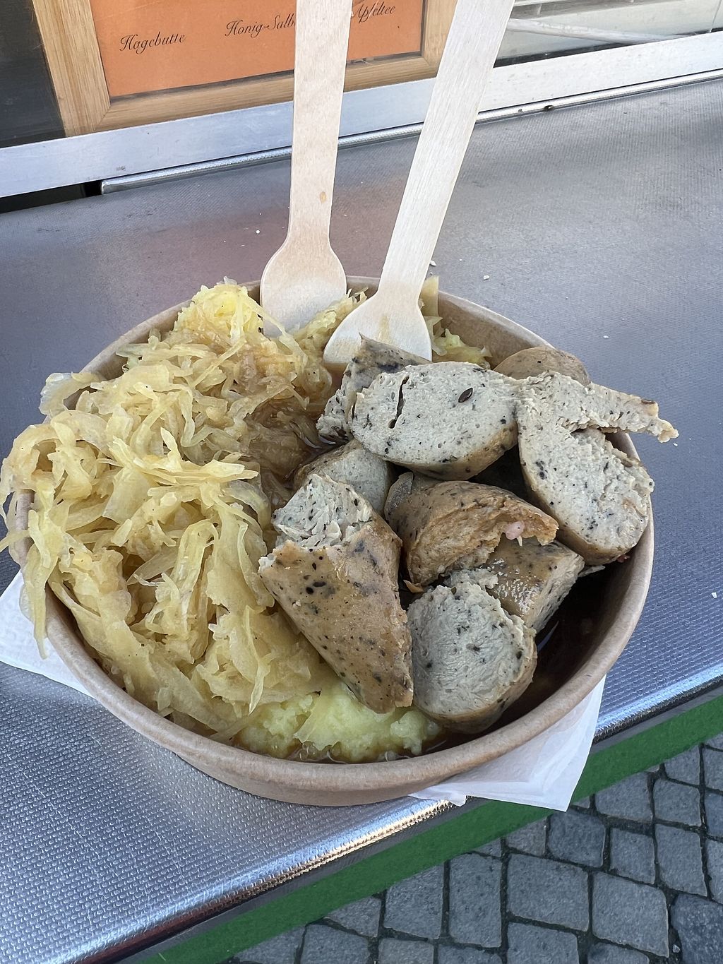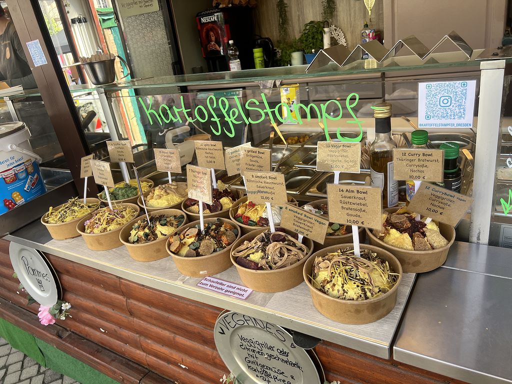 A stand at Dresden's markets (autumn, spring and Christmas markets) with a good selection of vegan dishes. The bowl with mashed potatoes, sausages and 'Sauerkraut' is our favourite. The staff are always very friendly. You can only pay in cash.