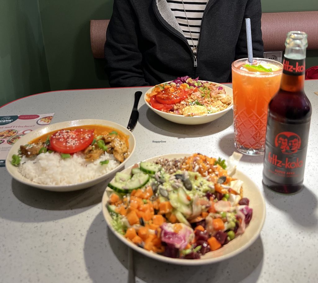 Wir hatten zwei Bowl, zwei Getränke und zwei Desserts. Die Bowl waren okay hätten erwartet das das Ersatzfleisch ein wenig warm wäre. Aber Sonaten waren sie okay. Die Dessert waren durchschnittlich, mein Cheesecake war ein wenig grisselig. Geschmacklich waren sie auch okay. Das Essen wurde schnell zubereitet. Ich fand das Preis Leistung Verhältnis okay.