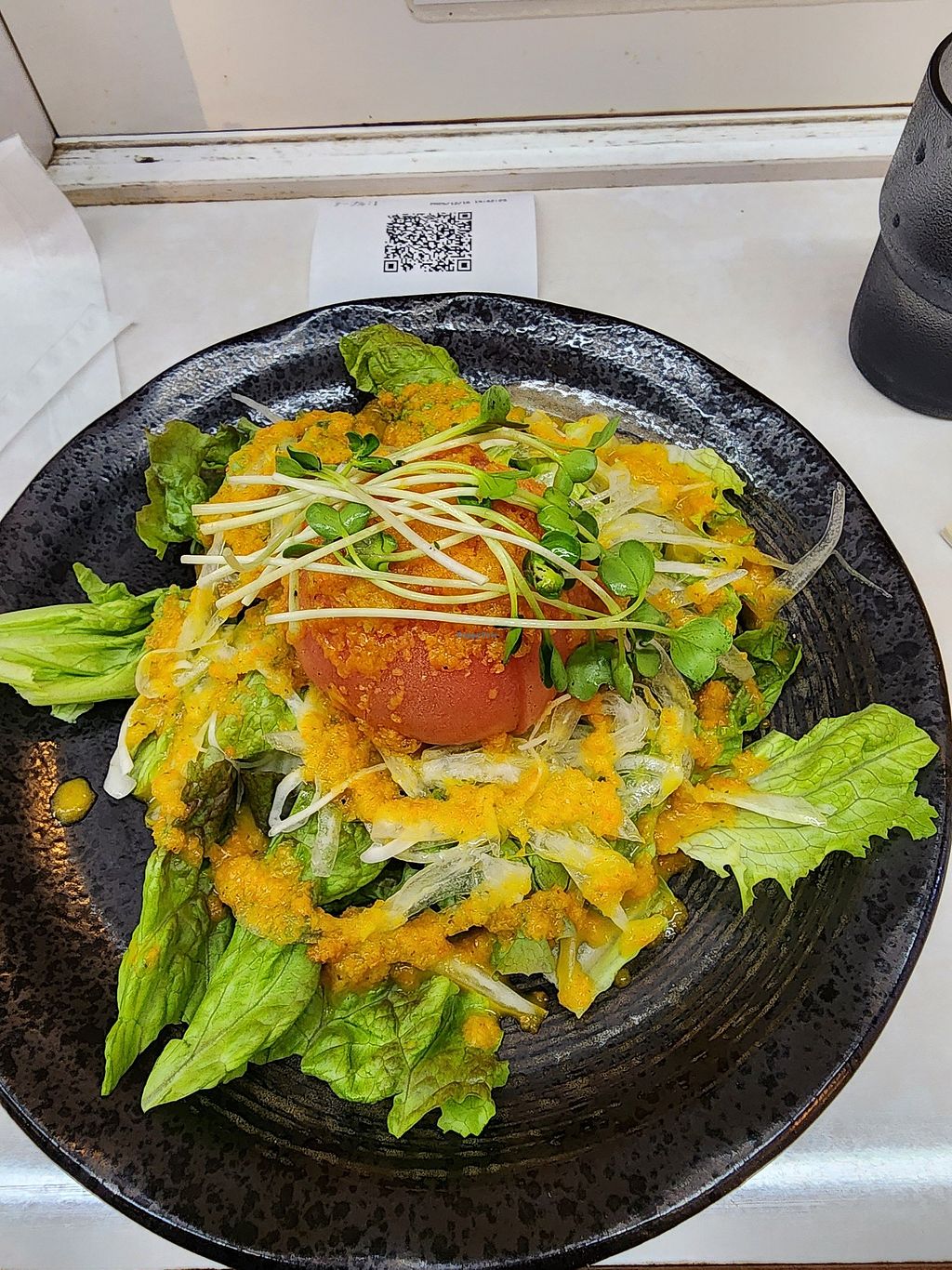 Obwohl einige der "Vegetable dishes" wie "Tofu cutlet bowl with egg" oder "Tofu katsudon (rice bowl with tofu cutlet)" Ei enthalten und somit nur vegetarisch sind, gibt es auch einfache, frische Optionen wie Tomato (¥440) und Tomato Salad (¥580), die immer eine sichere und vegane Wahl darstellen.