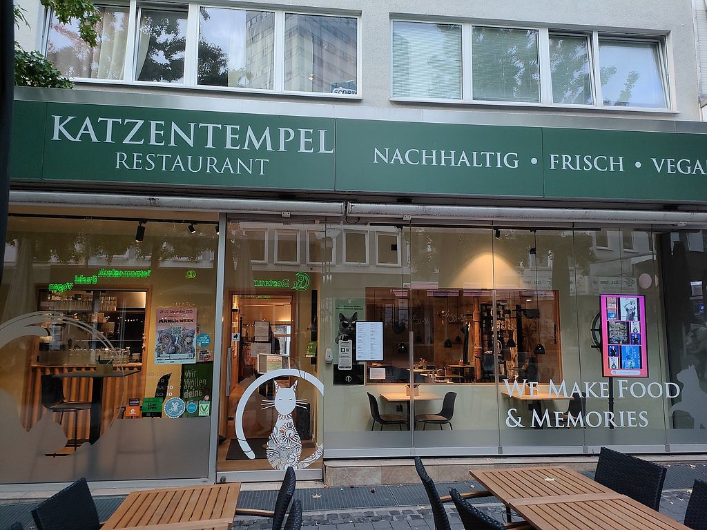Fully vegan “Temple of Cats” operates cat cafés across Germany, where diners can enjoy the company of rescue cats. Serves vegan food including breakfasts, soups, salads, sandwiches, daily plates, cakes, and tarts. Has oat and soy milk for drinks. Open Mon-Thu 10:00-21:00, Fri-Sat 10:00-22:00, Sun 10:00-21:00.