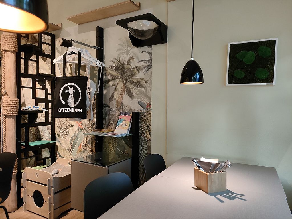 Read moreEine Reservierung online zu tätigen ging reibungslos. Angekommen wurden wir nach kurzer Zeit vorne am Eingang in Empfang genommen. Auf den ersten Blick war allerdings nicht ersichtlich, wo sich der Eingang befinden sollte. Ein weißes Schwenkelement, mit der Aufschrift,, Drücken'' sollte dann der Eingang sein. Die Aufmachung ist hell und freundlich. Das Lokal hat zwei Bereiche. Einen kleineren Berreich direkt am Eingang und einen etwas größeren weiter unten. Beide sahen sauber und ordentlich aus. Nun konnte man auch die ersten Katzen in ihren Tunnel/ Körbchen sehen. Sie machten alle einen entspannten Eindruck. Allerdings sind diese einen sehr hohen Lärmpegel der Gäste ausgesetzt. Leider musste man auch hier feststellen, das Tisch an Tisch eng gereiht war, um eine maximale Gästekapazität zu erreichen. Private Gespräche nicht möglich.
