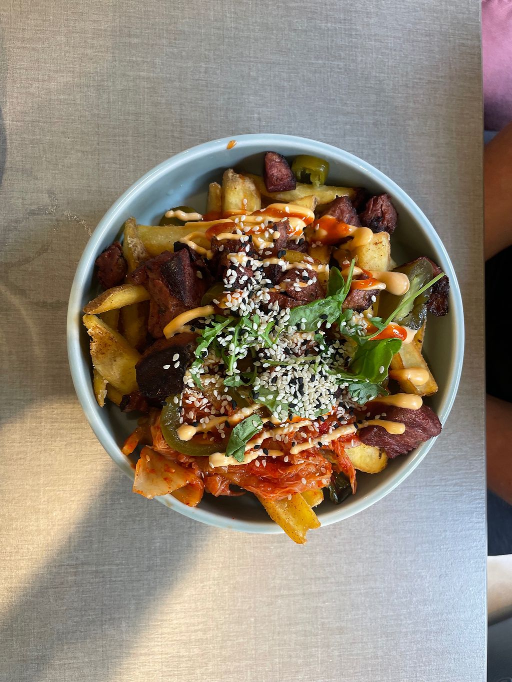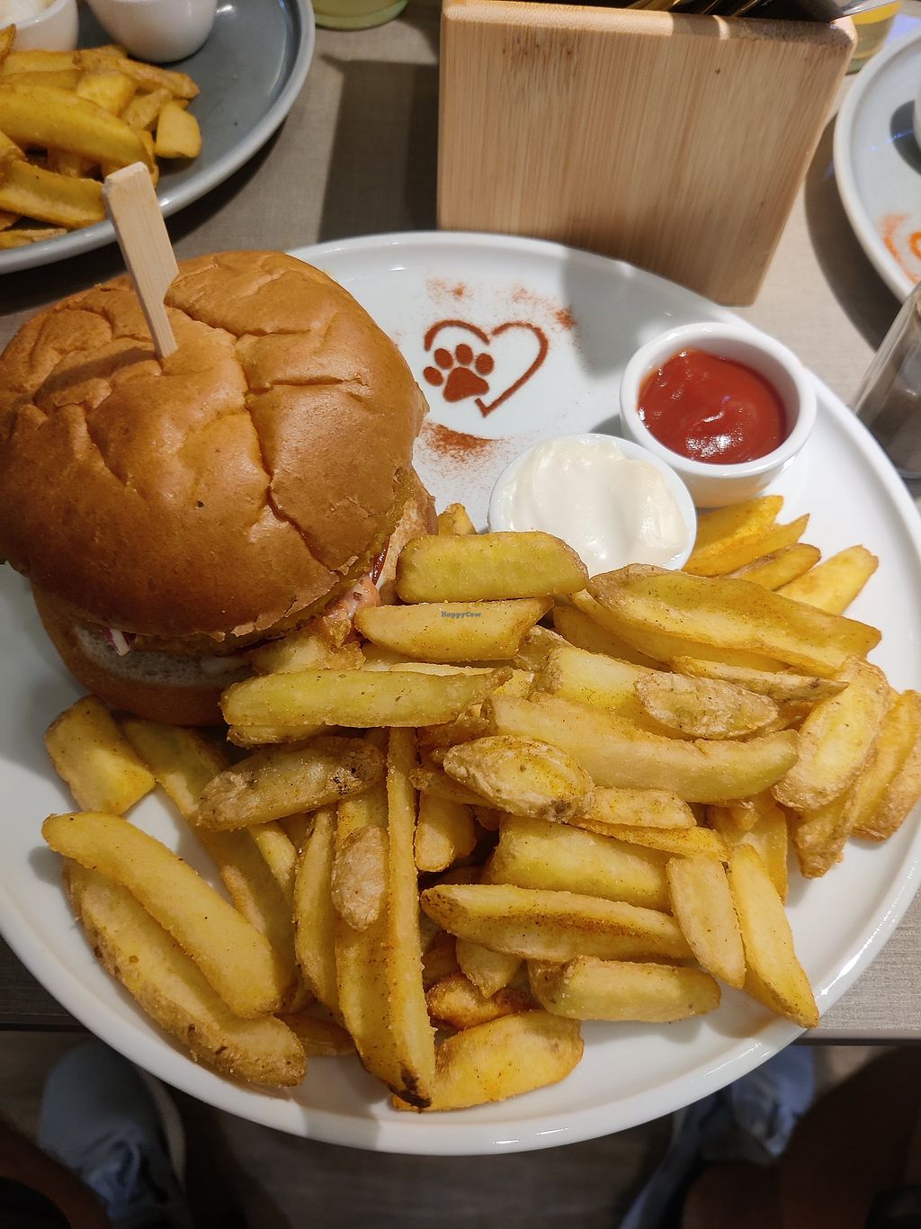 I had the beyond burger and fries. Very good and having cats around was nice.