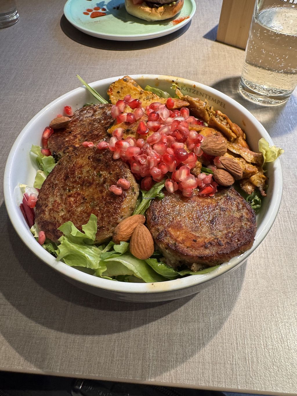 Der Katzentempel in Freiburg bietet eine rundum stimmige, rein pflanzliche Küche in gemütlicher, katzenfreundlicher Atmosphäre. Die Bowls überzeugen mit frischem Gemüse, Crunch von Nüssen/Sesam und sehr guten Dressings; auch das Crostini-/Aufstrich-Trio ist ein toller Start. Portionen sind großzügig, die Komponenten wirken hausgemacht und gut abgeschmeckt. Service herzlich und aufmerksam, Wartezeiten kurz. Ideal für einen entspannten Lunch oder Kaffee-und-kostet-alles-vegane Besuch – klare Empfehlung.