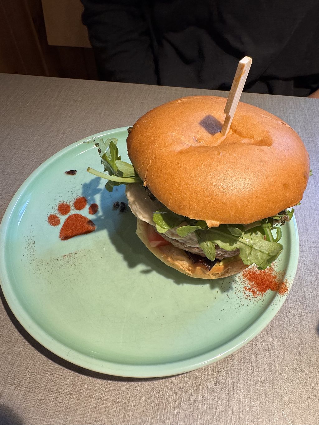 No cats upstairs to be seen, but it was a bit loud due to some giggly guests when we got there. It quiet down later, but maybe we'll have to reserve a table downstairs next time. The food was delicious -- really hit the spot. I had the "burger del gatto" which had a beyond burger featured their "miauzzerella", yummy basil pesto, tomatoes, and avocado. My partner had a pumpkin goulash with knödel, which was reportedly also excellent. Highly recommended if you're in Freiburg!