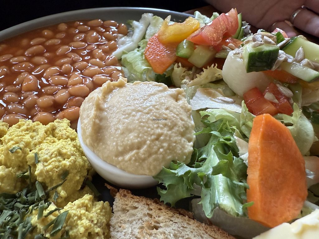 I had the Thai Carrot Soup with Bruschetta and it was so tasty I went back the next day for lunch. The bread is AMAZING. My husband had the Bavarian Breakfast both days because he loved it so much. It's served with non-alcoholic beer which I liked a lot. They have lots of vegan cakes that change daily. The only non-vegan thing they have on the menu is regular milk for their drinks, but they do have non-dairy milks for their drinks. And they of course have 5 friendly cats that roam around the cafe.