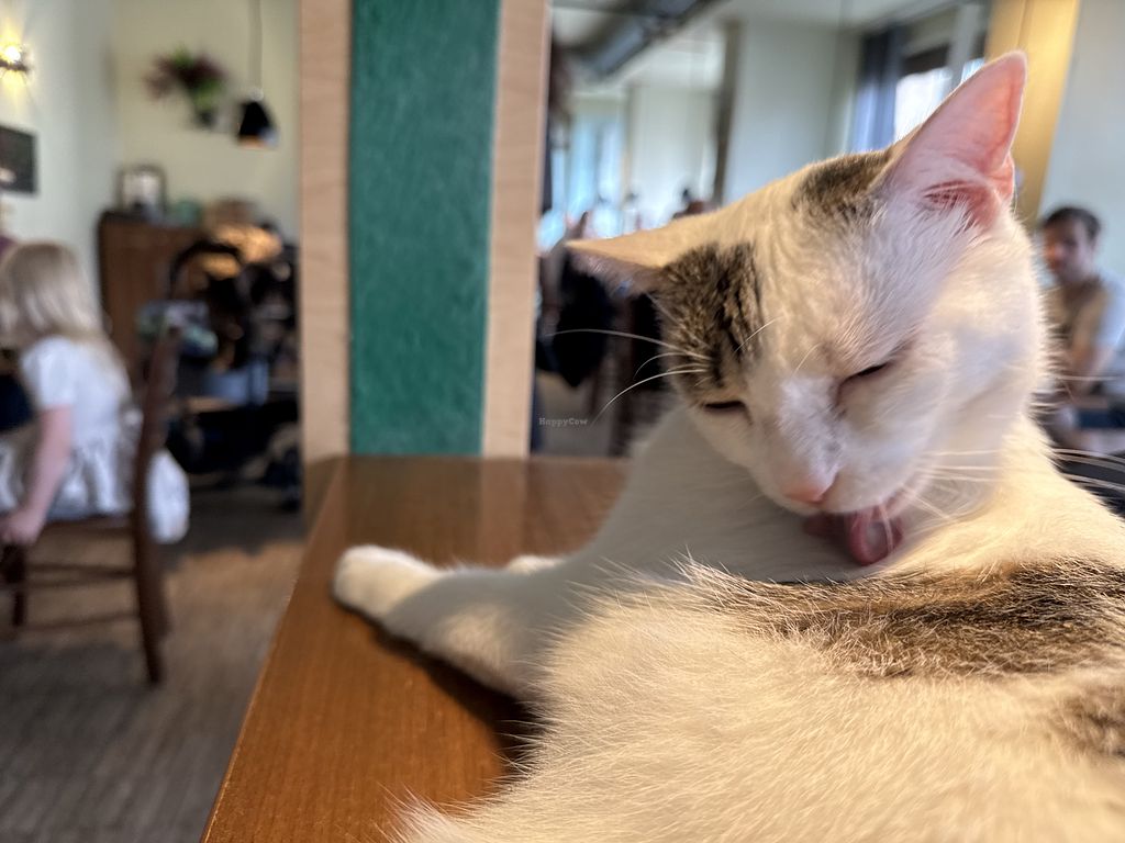 Its a concept cafe with 6 cats they are living there. So it would be better to be in cats😄For this reason there are special rools too, like not running fast or open the door. Thats important for the sweet kittys. I found the athmosphere not cosy at all, but thats a question of what you Like. BUT: the big salad I ordered was only green leaves and a bit carrots and paprika and as topping tofu. Boring taste and nothing special like different salads or herbes or... And that all for 10 Euro. Really expensive for nothing. I ate afterwoulds a protein bar I bought before. For me never again.