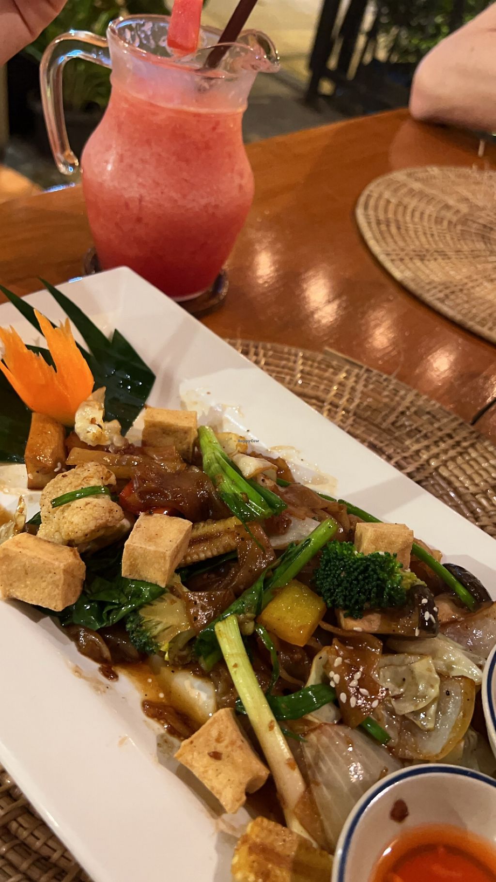 We were staying away from Lamai beach on Koh Samui, our friends had told me about this place as they'd been there last year and lucky for us it was at the junction of the main road and on the road leading to our resort, only a 15 minute walk. The first night we were hungry so ordered the potato, sweet potato & taro fries, tempura vegetables, the open sandwich of pumpkin, tahini and basil, and the Pad See Ew with tofu. The waitress asked if we were ok with egg or not, it's good that they check. The fries were good but a bit too similar to the tempura so not what I was expecting, the open sandwich was really tasty, kind of like hummus but not and the Pad See Ew was delicious with big flat fried noodle. We also had a couple of mixed juices that were a good size, served in a small jug. It was a busy place and the guy (I assumed to be the owner) was really nice & friendly. The following night it was busy again, we started with the spring rolls, I had the Pad See Ew while my girlfriend had the Buddha bowl which was huge, again we had really tasty juices. For a non-vegan place I've got to say the food was really good and very reasonably priced, definitely recommend this place.