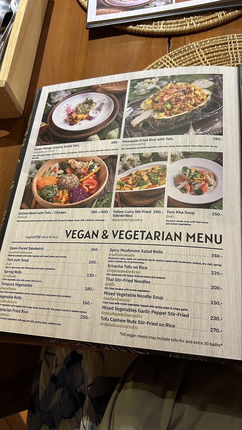 There is a vegan menu that includes honey and we ordered a buddha bowl which was served with a non-vegan dressing. Anyway the bowl was delicious (without the dressing obviously) and the paneng curry as well. Its an expensive restaurant, definitely not a one $. More like $$$