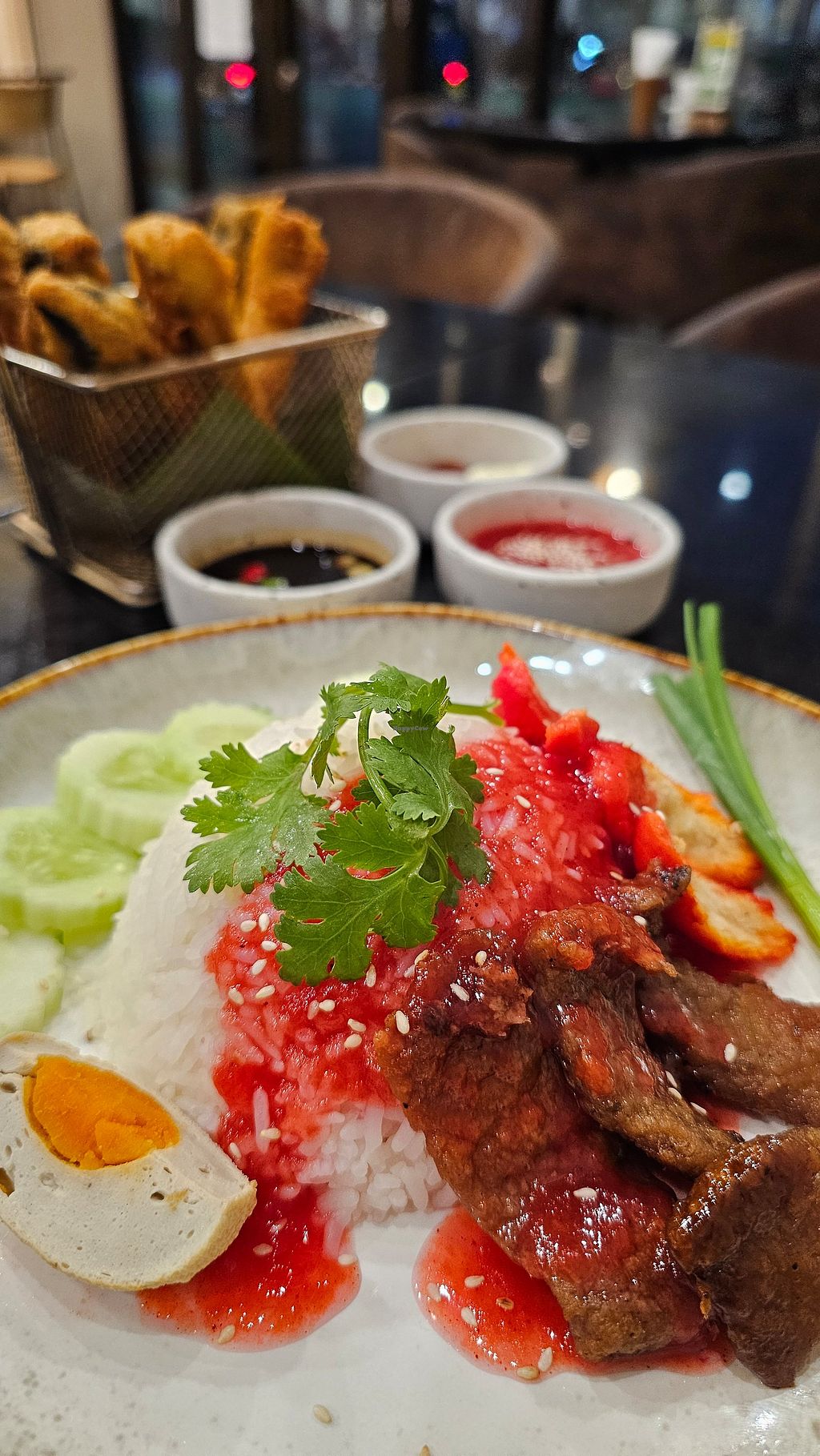 Great restaurant with nice interior. The food was really flavourful and yummy. We had the pork pad Thai, massaman curry and the signature fried pork appetiser and the fried pork was one of the best vegan foods I’ve ever had! Would recommend!