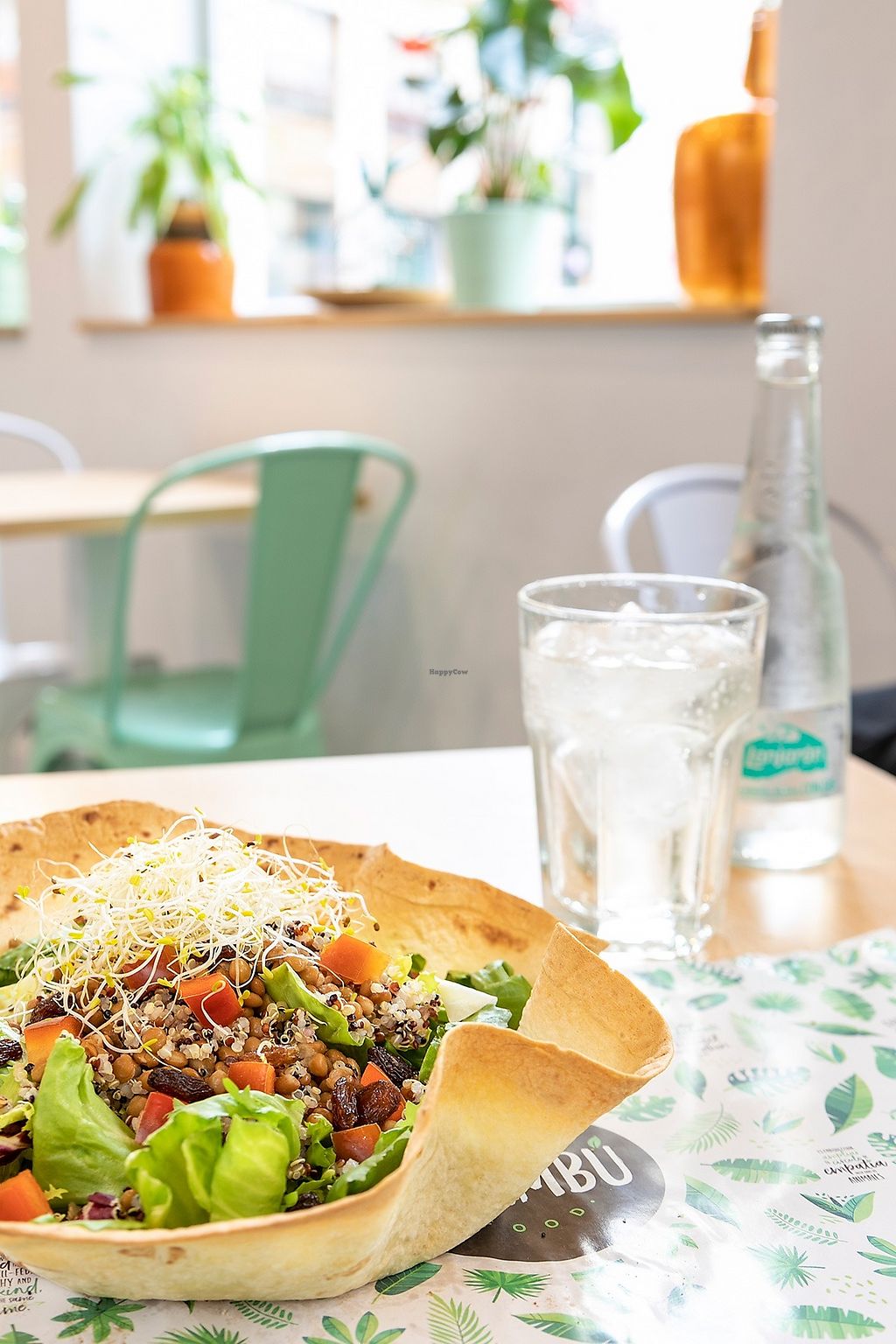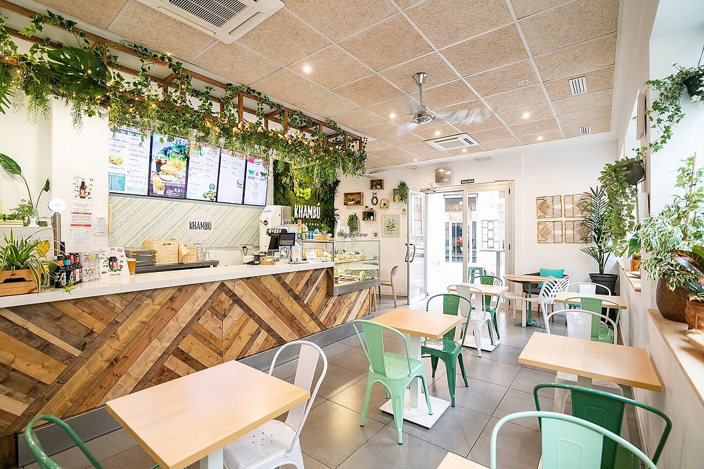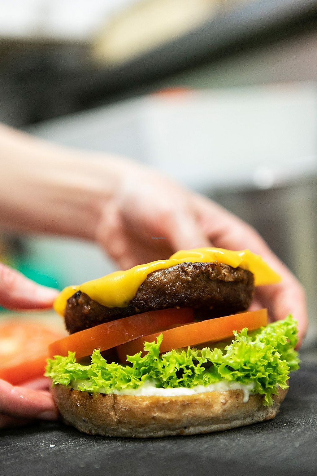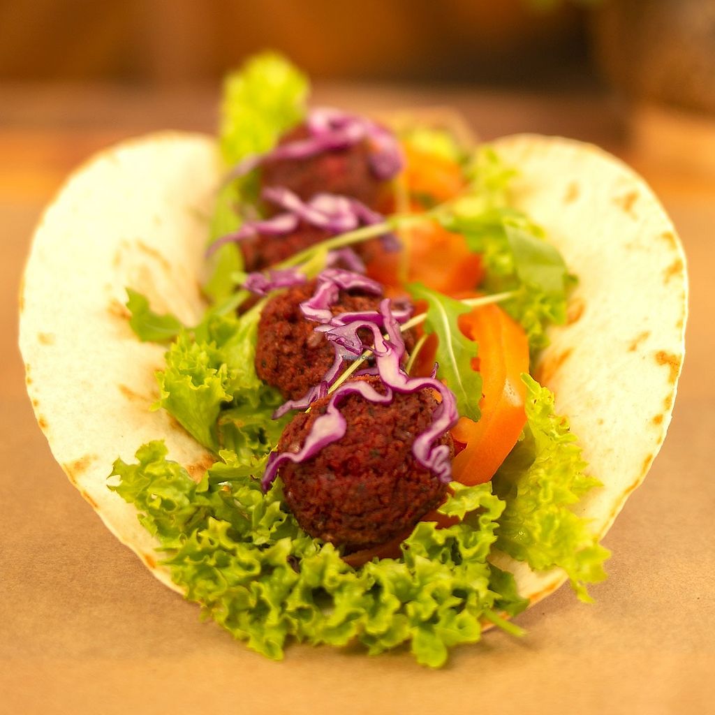 Hamburguesa, aros de cebolla, brócoli con salsa de cacahuete, wrap de …