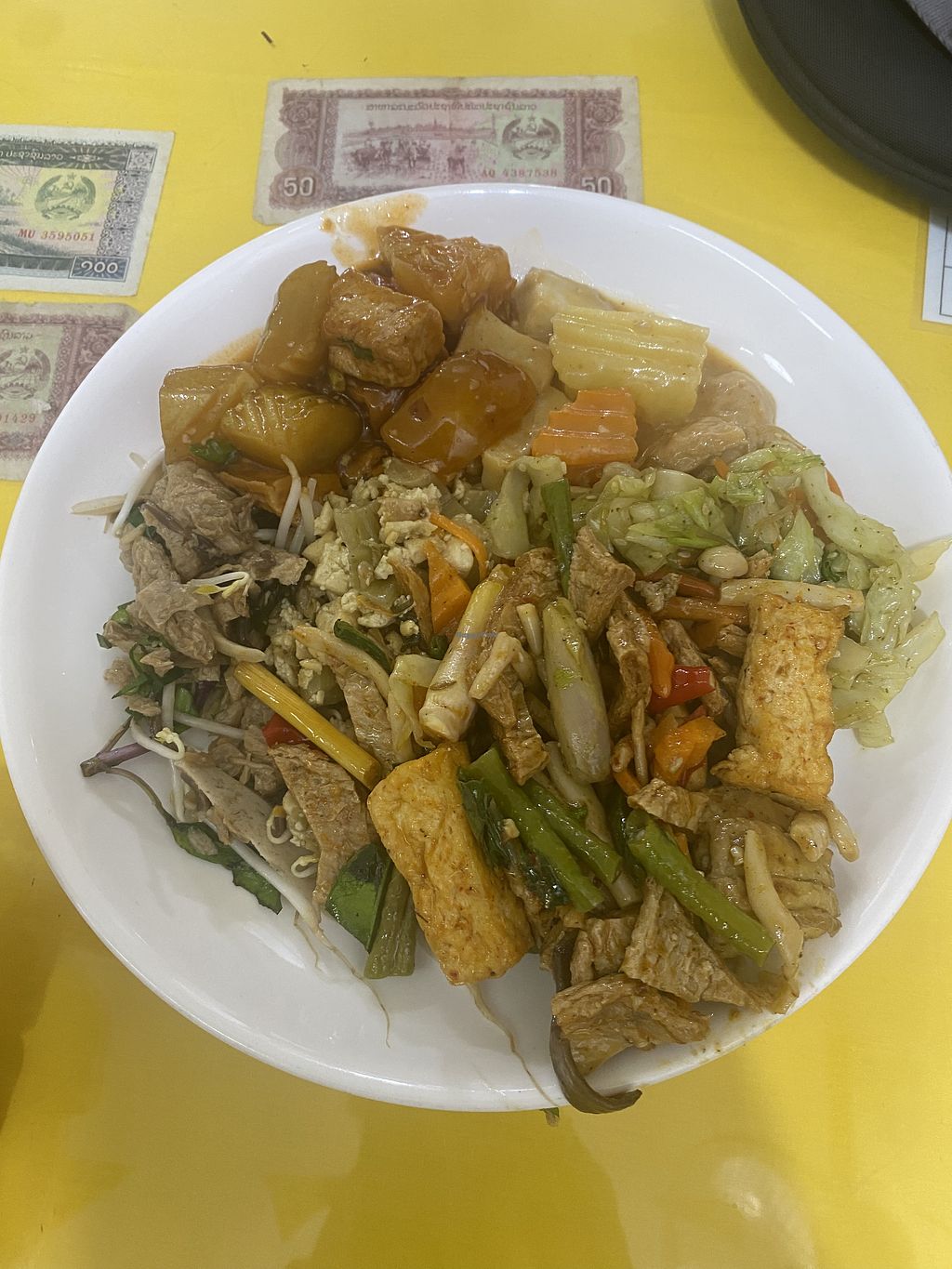 buffet with many options for 50k lak or only three dishes for 25k lak. take away starting from 10k lak. some dishes are spicy and other are not. some are tasty and others not. the location on happy cow is correct, but the place doesn't really look like an restaurant from the outside haha. staff is friendly. they also have a small shop for selling vegan products.