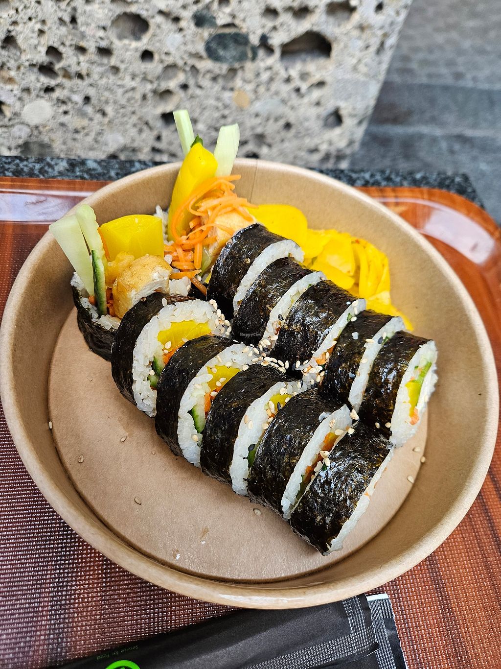 We had vegan kimbap, vegetable mandu and kimchi jiggae, the food was delicious.