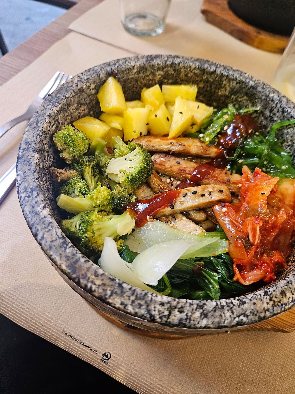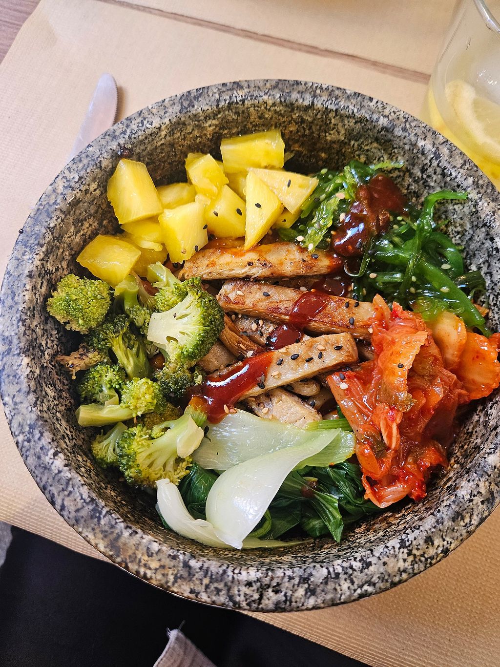Cocina asiática, coreana, fusión. Oferta de opciones vegetales como gyozas y la bowl vegana. Discreta calidad de la comida. Porciones abundantes. Buen servicio, personal muy amable