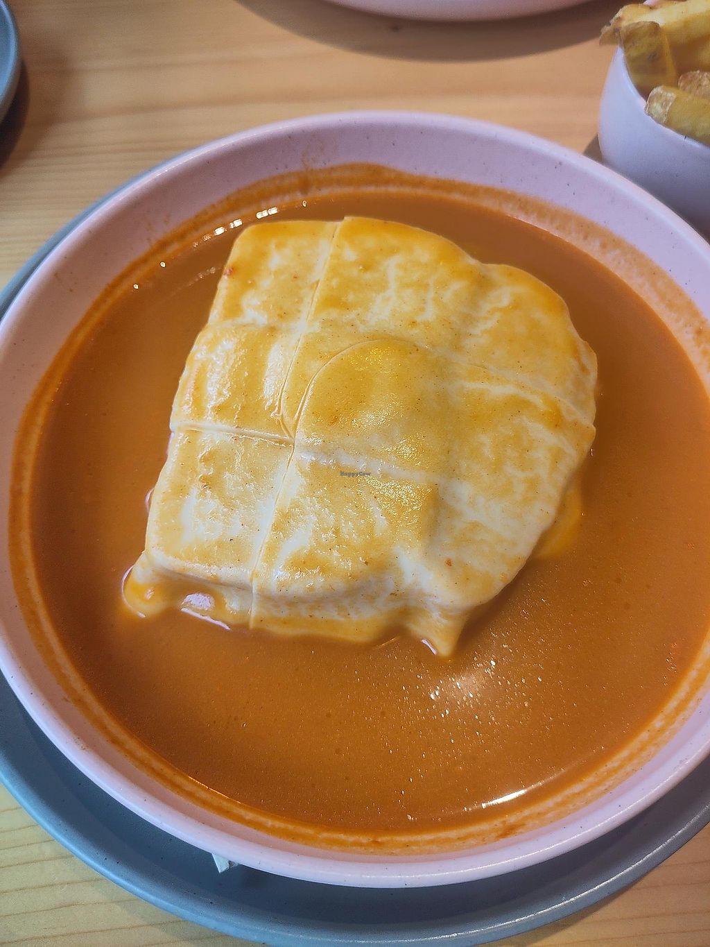 Pedimos burrata vegan, korean tofu y francesinha con huevo. Todo rico, quizá la francesinha excesivamente fuerte de sabor y la burrata al ser de tofu un poco floja pero rico de todas formas.