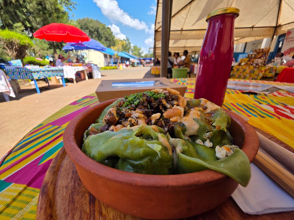 This food stall at the Organic farmers Market in Kilimani has a few vegan options. The owner knows what vegan means and can tell you what is in the food. I had the dumplings with cabbage and tofu topped with a little peanut sauce and chile. Amazing! I also had a cold drink made with red cabbage and celery. Also delicious. You can buy fresh hand-made noodles here as well - to take home, boil and serve however you like. There is a three-pack of noodles with three varieties: beetroot, spinach, and carrot.