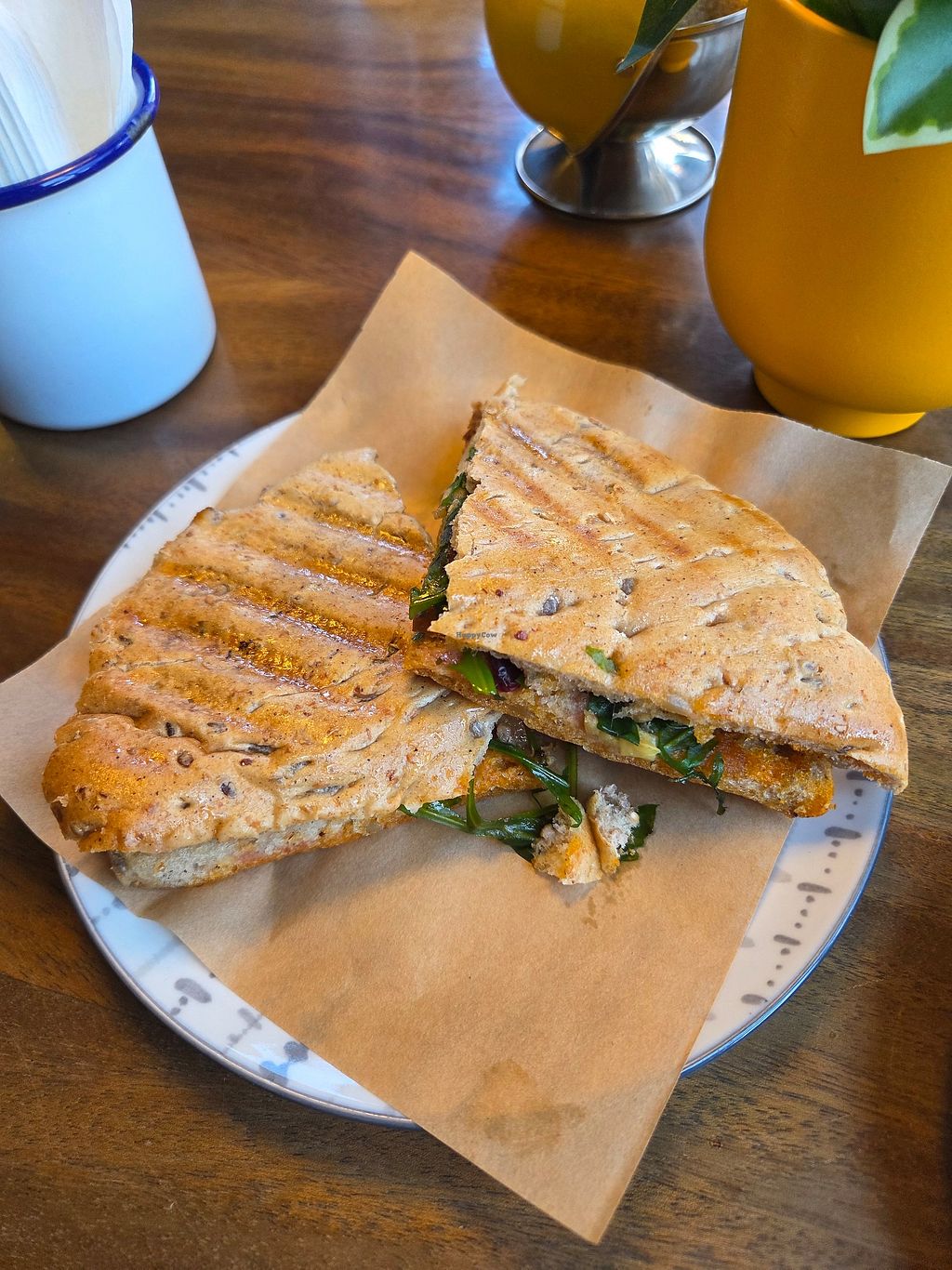 The panini with mushrooms and cheese was very filling and tasty. The brownie with peanut butter as well. Also, we befriended a lovely sparrow so that was a bonus