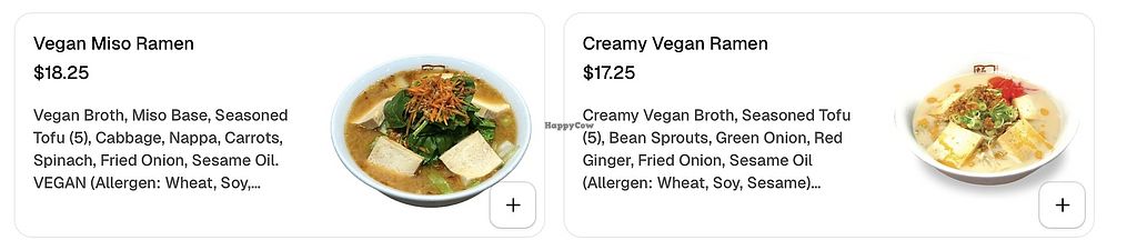 Serves meat, vegan options available. Ramen restaurant offering vegan options, including creamy vegan ramen, miso vegan ramen, cucumber salad, edamame, steamed rice, and tea. Open Mon 11:00am-9:00pm, Tue-Fri 5:00pm-9:00pm, Sat 5:00pm-10:00pm, Sun 11:00am-10:00pm.