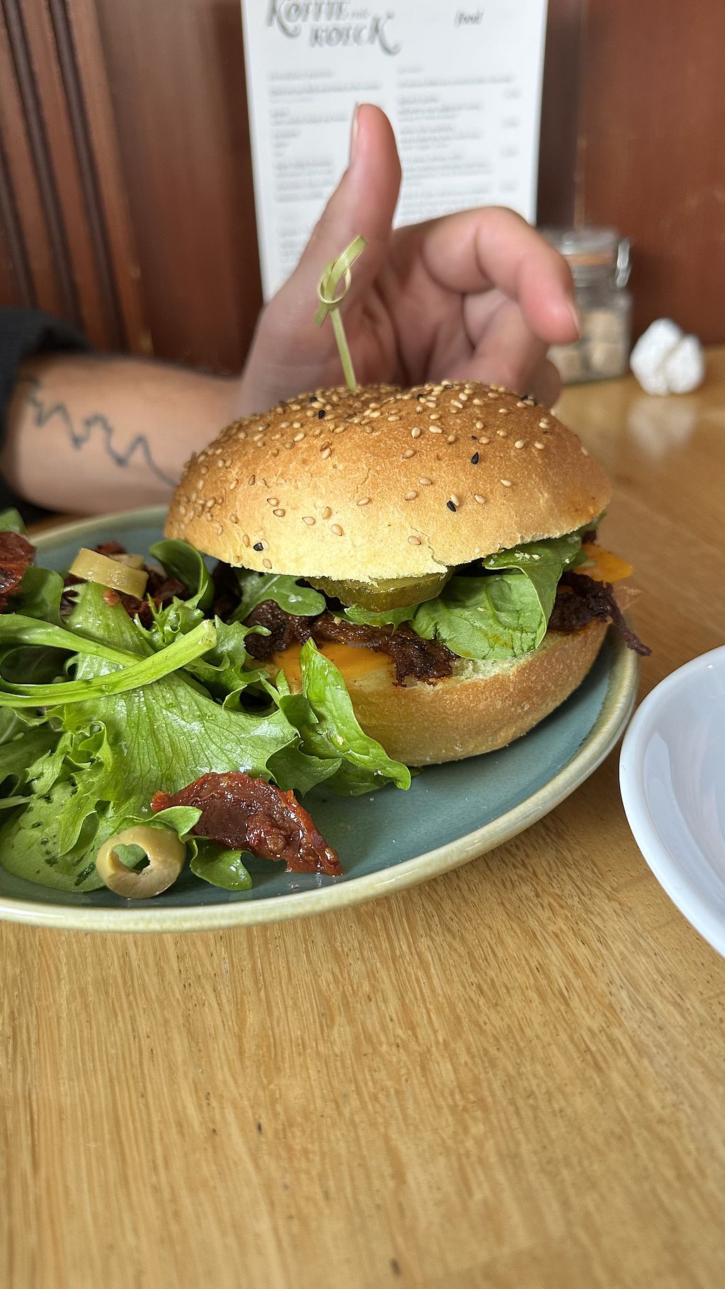 De Pulled & spicy mushroom sandwich met brioche bun is GEWELDIG! De smaken zijn perfect op elkaar opgesteld. Inderdaad een beetje pittig, maar niet te.